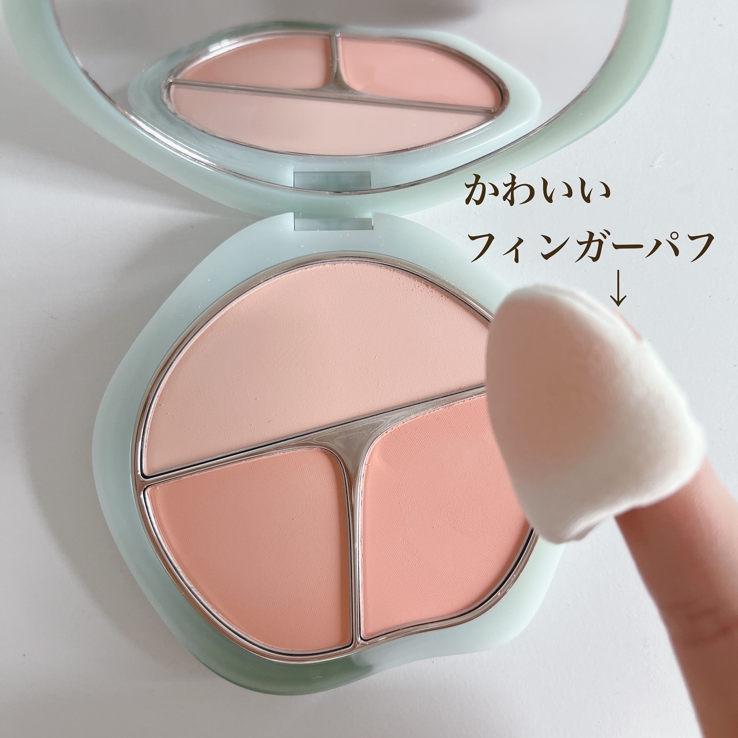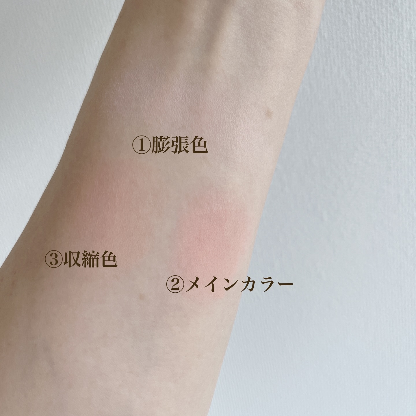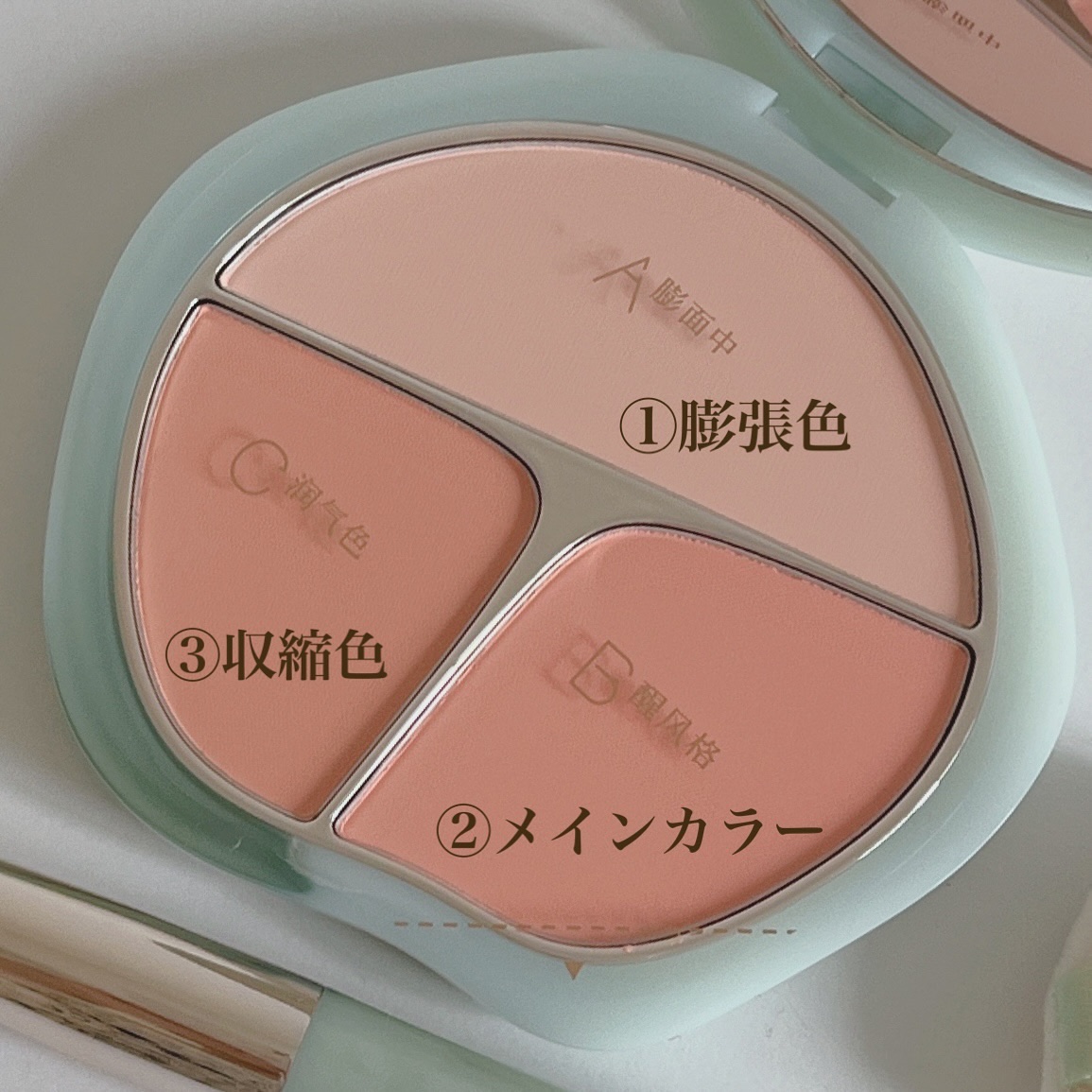 - 「膨張色+メインカラー+収縮色」の三色一体型チークパレット。 異なる明度と彩度の色で自然なグラデーションと立体感を作ることが可能。単色で使用すれば様々な雰囲気のメイクが楽しめ、違う色を重ねて使用すると、三色が程よいバランスで雰囲気と立体感を作り出す。
