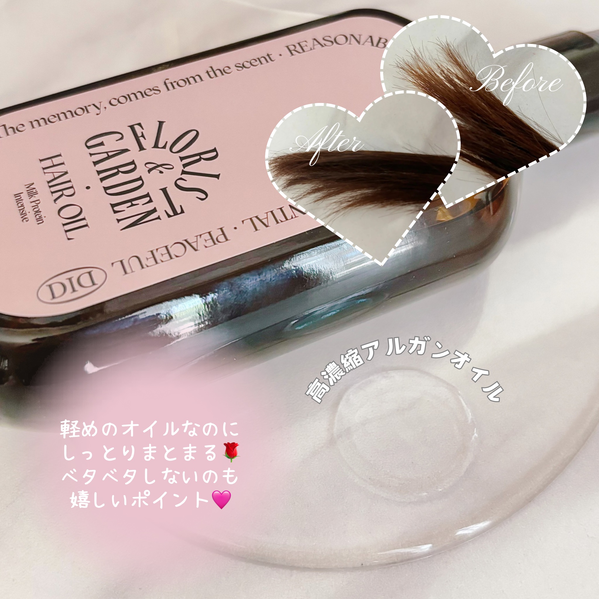 高濃縮アルガンオイルで保湿ケア、栄養ケア、ダメージケアまでしてくれるよ! 甘く爽やかなホワイトローズがいっぱいの庭園で過ごす正午のイメージ😳 長続きする上品な香りで毛髪ケアをしたい方