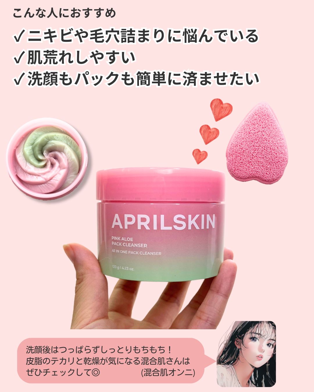 ピンクとアロエ色、またホイップしたような見た目がとっても可愛いです。 テクスチャーはふわふわしっとりなめらか。なめらかに伸びて、優しくなじませることが出来ます。 肌が食べる新感覚メレンゲクレンザー! やわらかい濃度で埋め尽くし、毛穴の隙間まで完璧に皮脂・老廃物・黒ずみを吸着。 保湿成分と自然クーリンク成分で使用後の毛穴引き締めまで。
