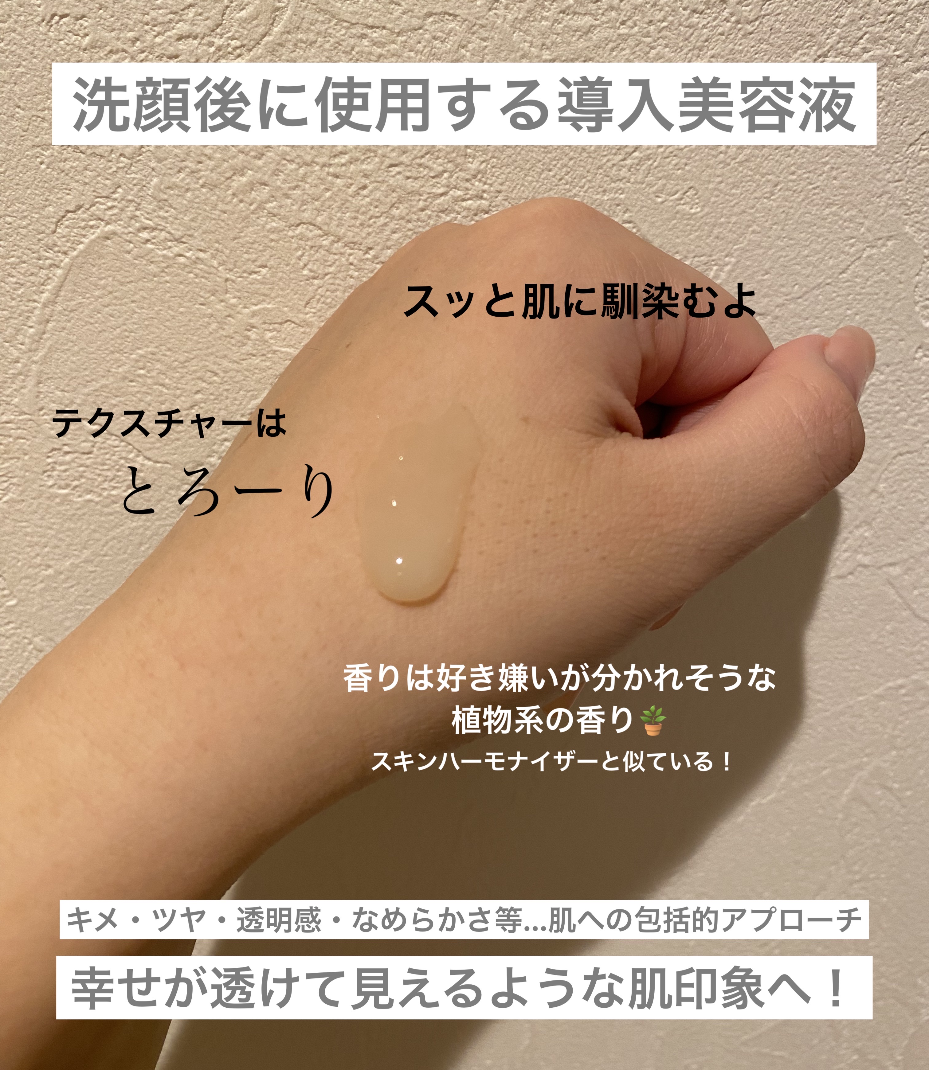 KANEBOの新作美容液をご紹介。幸せ肌の4要素、うるおいに導かれたキメ・ツヤ・明るさ・なめらかさに着目。こだわりの美容成分(保湿)を贅沢に配合。 軽めのテクスチャーはとろみがあって滑らかな付け心地。伸びがいいので首の方まで馴染ませられます。しなやかなハーバルフローラルの香り付き。 即効性があるものではないかなと思いますがこの付け心地、使い心地は是非試してみて欲しい…使い続けたいなと思えるそんな新作でした。