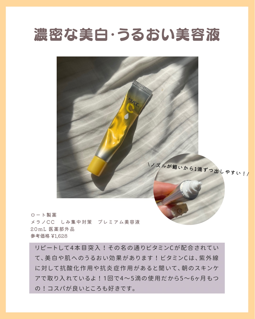 何度リピしたかわからないほど、お気に入りの美容液。 コスパもすごくよくて、ビタミンC系のスキンケアを取り入れたい方におすすめ! しみ・そばかす予防に効果のあるピュアビタミンCを配合。つけた瞬間からすぐにビタミンCとしての効果を発揮してくれるんだそう。 ロート製薬は長年の研究により、ピュアビタミンCを安定的に配合&皮膚に浸透させることに成功!プチプラなのにすごい技術✨