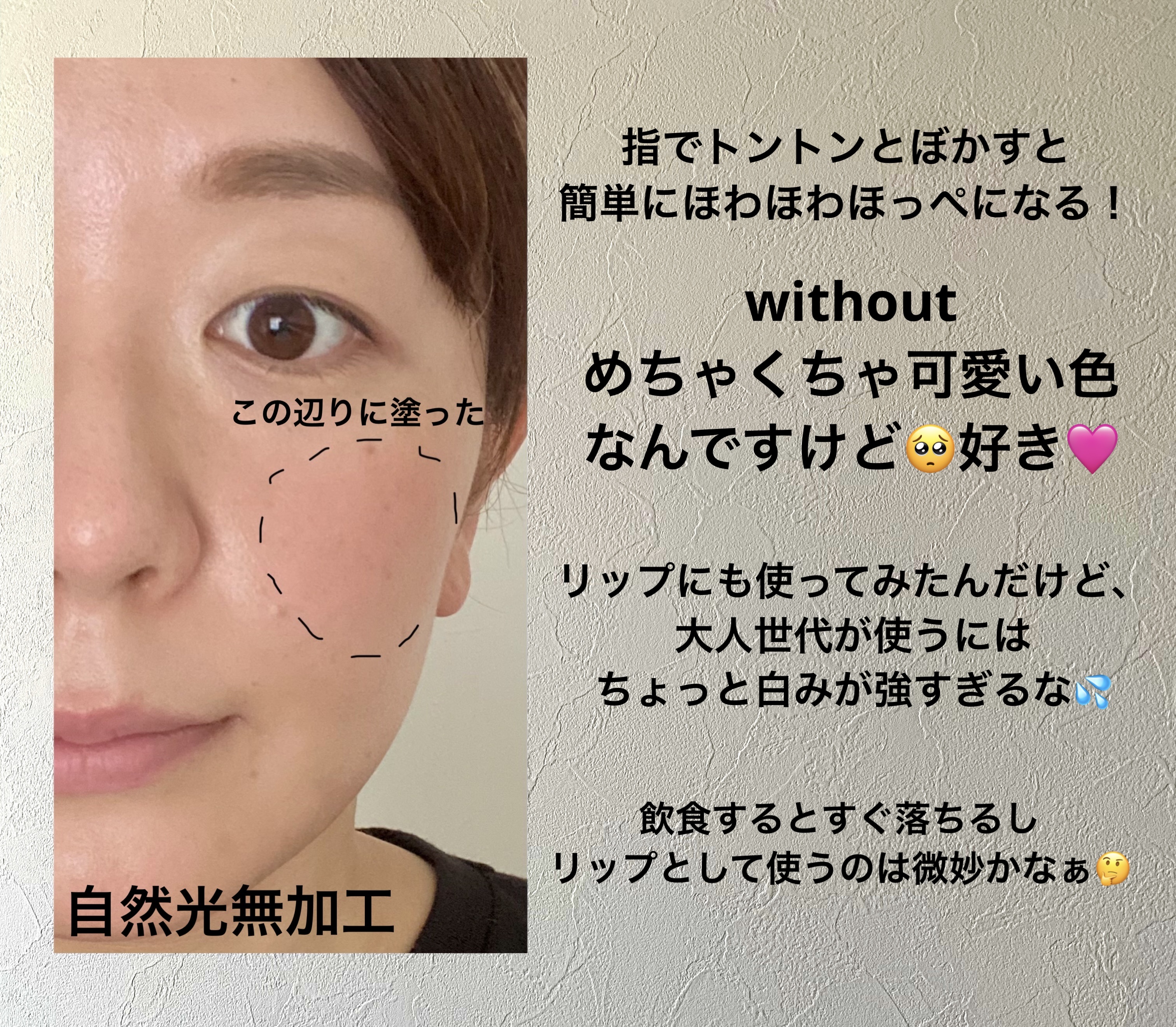チークはハイライトカラーとニュアンスカラーの2色になっていて、 混ぜても使えるし チーク以外にもハイライトしても使えるかなと思います👍🏻 肌調子が悪くボコボコしていてわかりにくいかもしれませんが😅 テクニックいらずで簡単にグラデーション&立体感が作れます! ふんわりと薄付きなので失敗しにくいと思う✌🏻