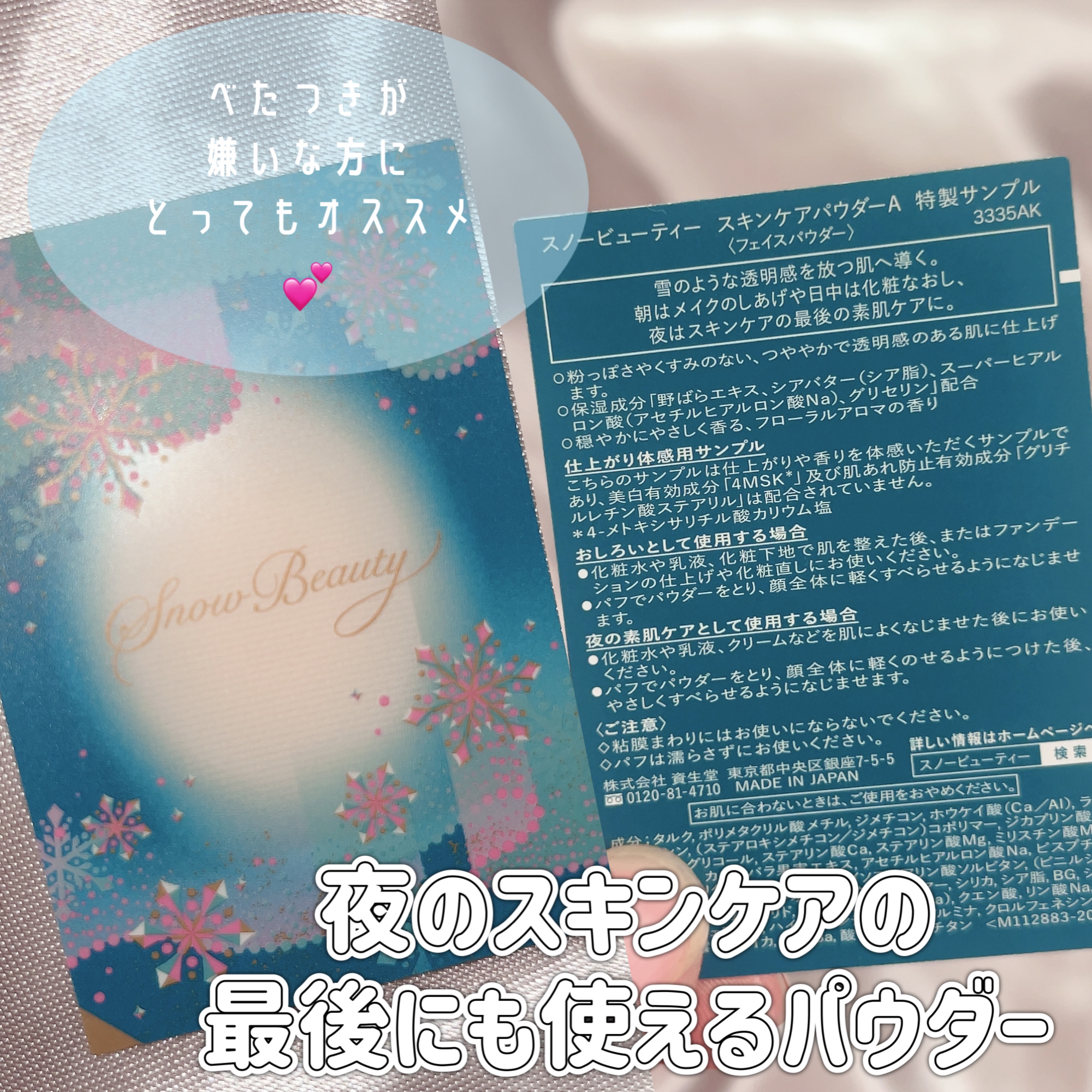 最近出番の多いスノービューティー✨朝も夜も使えるパウダーだけど主に夜メインで使ってるよサラサラに仕上がるので夏にいい感じ!有効成分が2つも配合されていて期待大昼に使う時はお肌を休ませたい時に使用軽い付け心地でとても良い💯ほんのり香り付き#スノ...