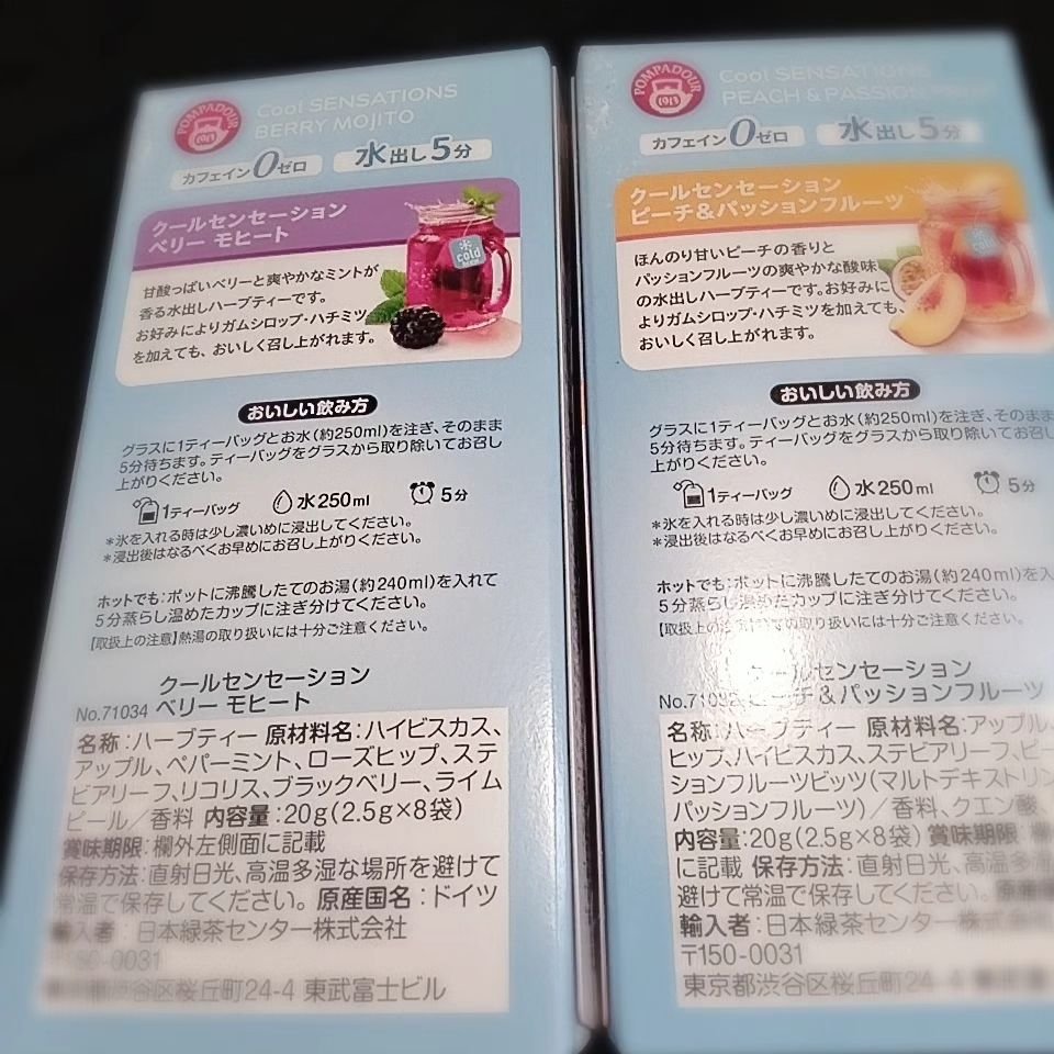 ポンパドール コールドブリューピーチ&パッションフルーツベリーモヒート˖٭.˖٭.˖٭.˖٭.˖٭.˖٭.˖٭.˖ポンパドール様ご提供いただきました✨冷たい水で簡単に作れる水出しフルーツティー🍑水とティーバッグを入れて5分で完...