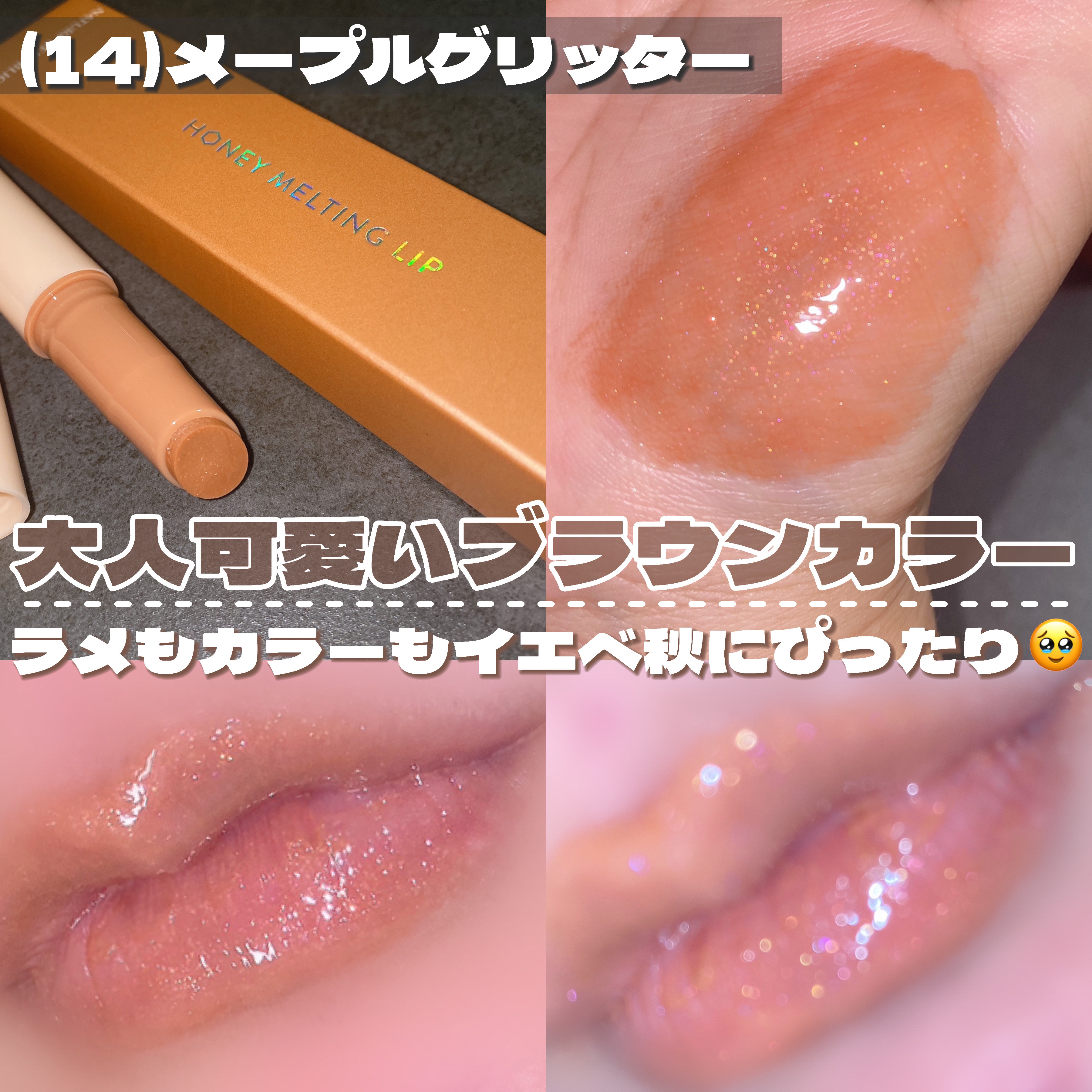 ぎらんぎらんグリッターリップ💄💗ネイチャーリパブリックハニーメルティングリップ13オーロラグリッター14メープルグリッター¥1,320オーロラグリッターはピンク×ブルー×パープルのパールメープルグリッターはゴールド×レッド×ブラウンのパールギ...