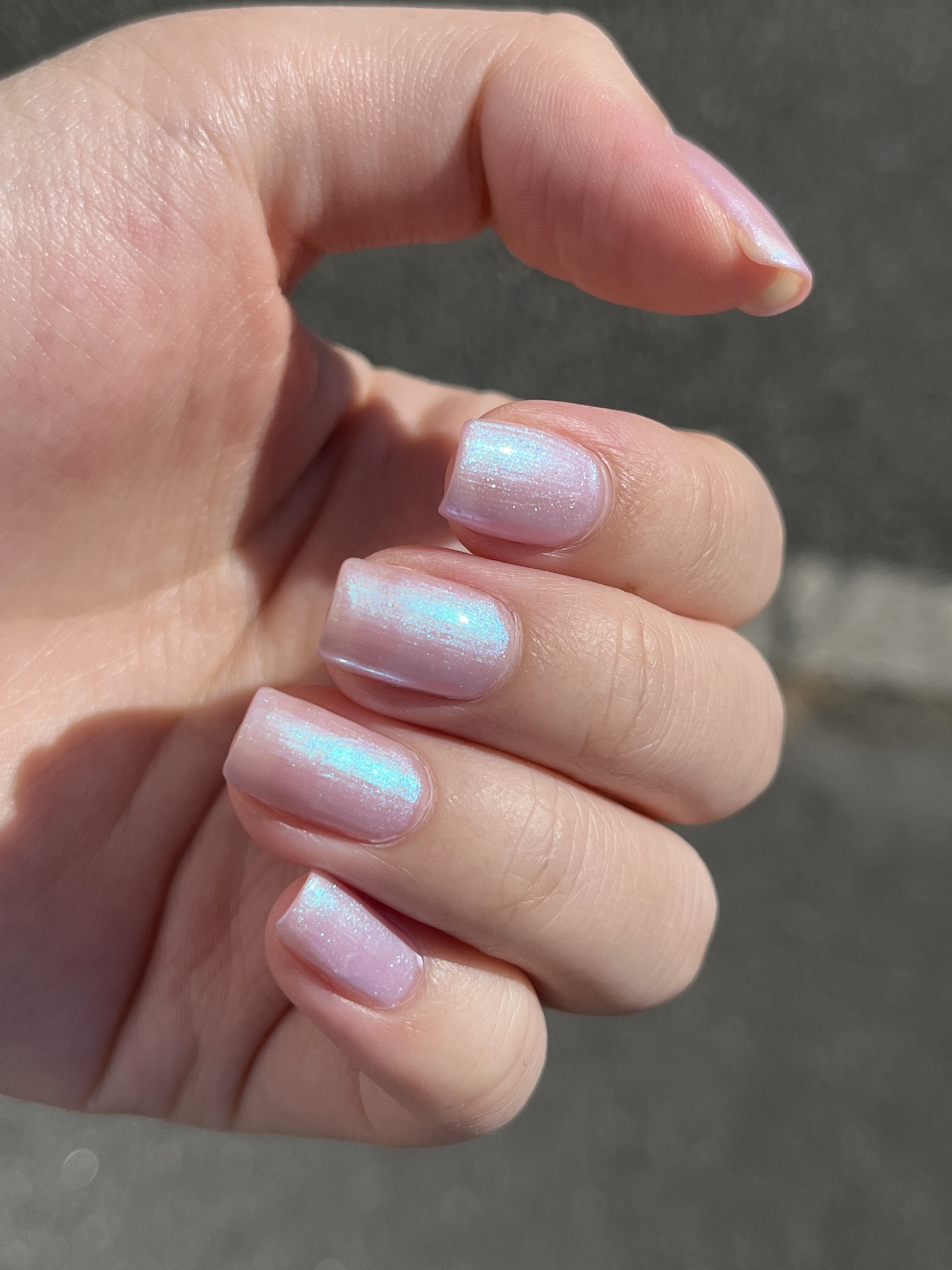 見た目は結構紫で、買う時に使いこなせるかな……?とちょっと不安だったんだけど、乗せるとベースの色は結構赤みが強めに発色してあんまり紫感無いから、寒色使い慣れてなくても意外と馴染むんじゃないかな🤔 ラメのみのシャドウというよりベースがしっかりあった上のラメなので、単体で使ってもめちゃくちゃ可愛いから結構使いやすいよ〜 これは完全に一目惚れで手持ちとの相性とか何も考えずに買っちゃった……色名までおしゃれで好き 偏光の青ラメがキラッキラで塗るだけでテンション上がる……このラメが1320円で手に入るからほんと最高