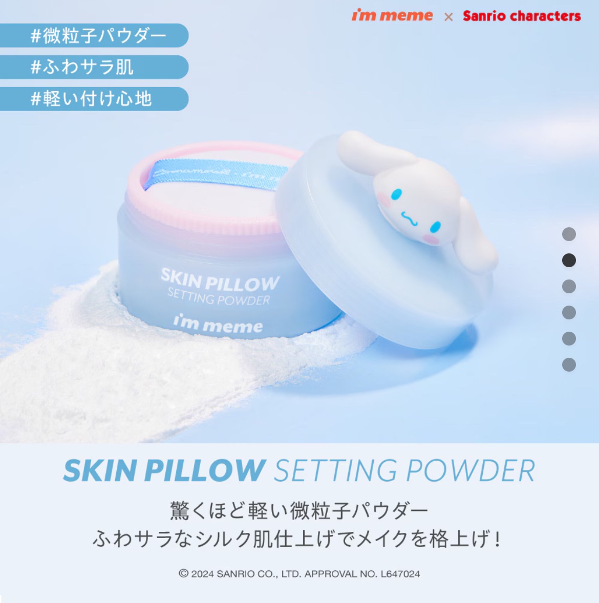 i’mmemeスキンピローセッティングパウダー以前購入していたシナモロールコラボのパウダー。蓋側に付いているシナモがプニプニ柔らかくて可愛い♡粉は細かくて白いパウダーですが、白くなる事はありません。ただパフにドバッとついたままお肌にのせると少...