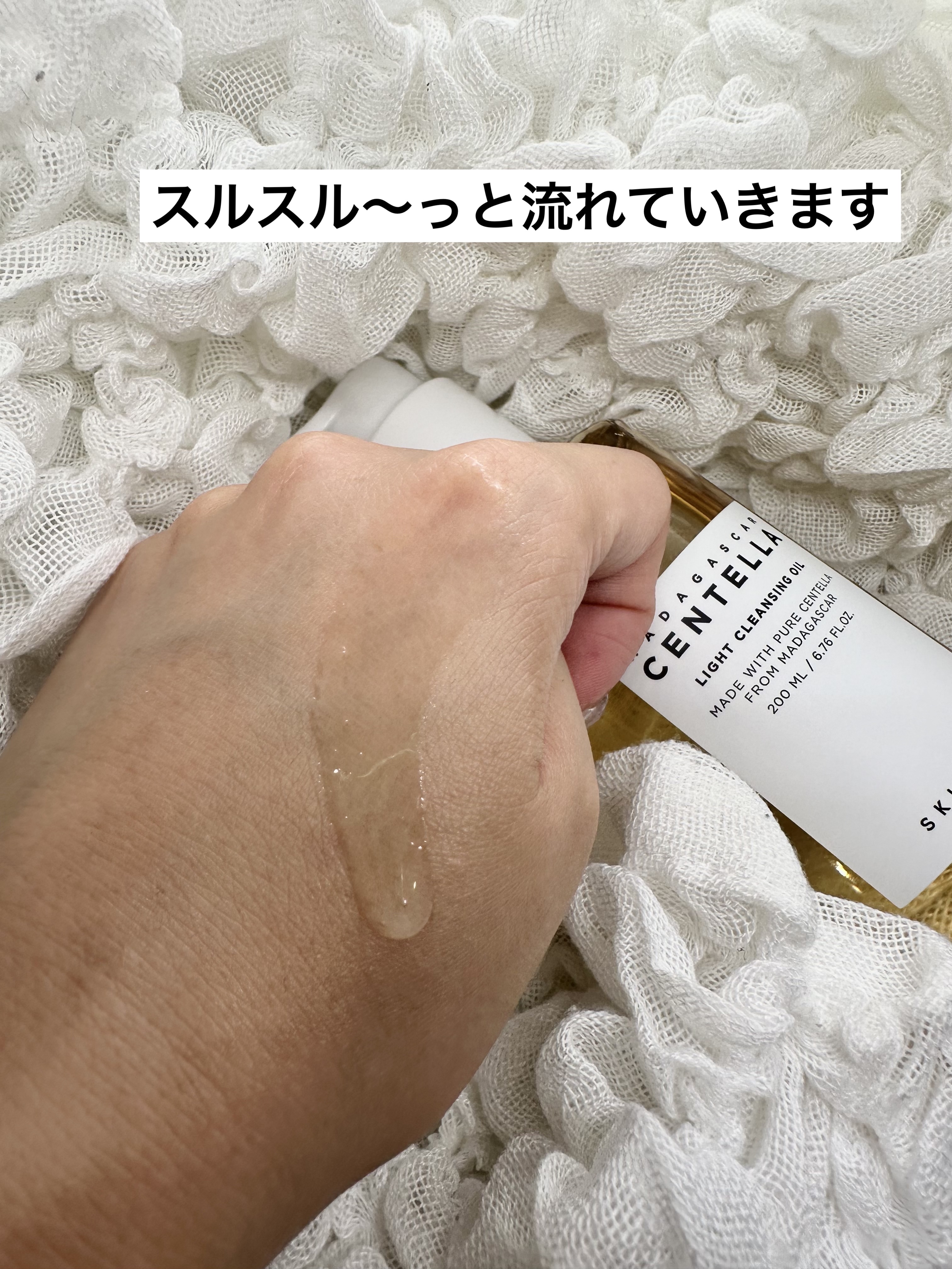 クレンジングオイルの中では、わりとサラサラめのテクスチャではないでしょうか。スルスルと肌に広がり、水と混ぜるとすぐさま乳化してくれるので、洗い流すときもオイル特有の重たさを感じることなく簡単に落とせます。 いつもウォータプルーフのコンシーラーを使用していますが、きれいに落とせました!ポイントメイクを落とすときも肌への負担は感じません。 センテラシリーズはしっかりとした保湿力がありつつ、ライトな使い心地なので通年で使えるのが嬉しいです。