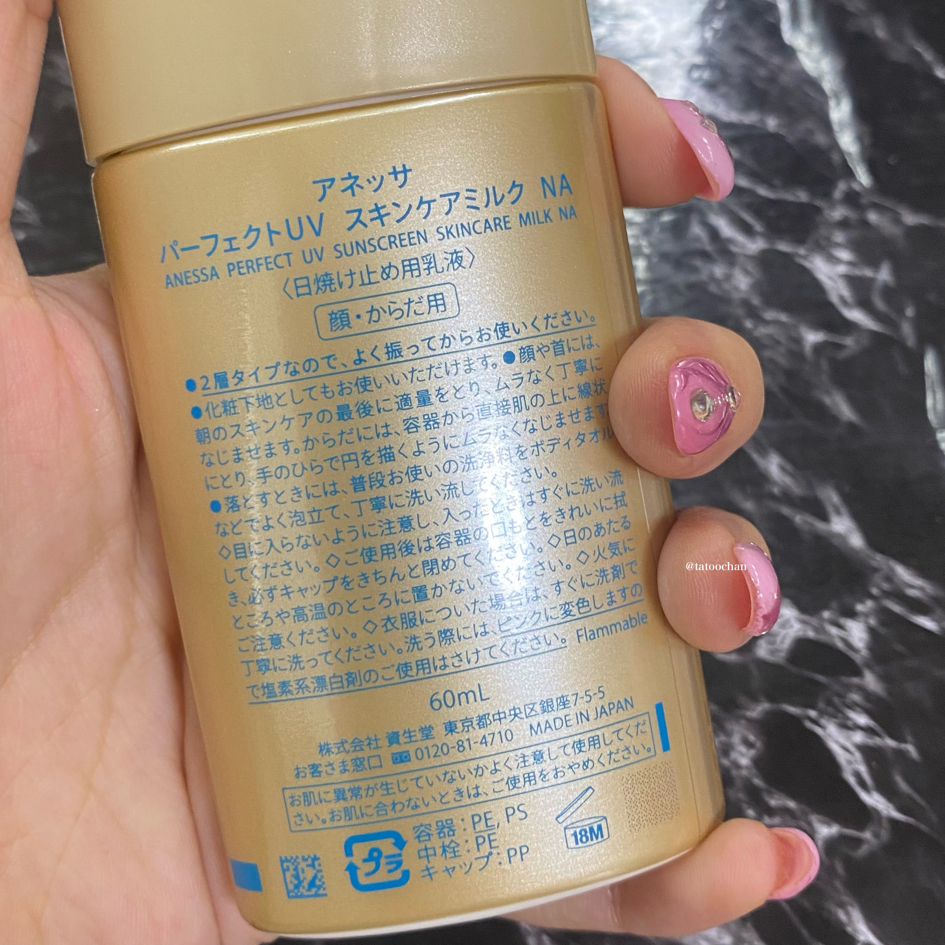 アネッサ パーフェクトUV スキンケアミルク NAさらっとしたミルクタイプの日焼け止め☀️のびがよくて全身するする〜!SPF50+/PA++++だけどせっけん落ち🙆♀️乾燥肌なのでキシキシしないのが嬉しいです!アットコスメのプレゼントに当選...