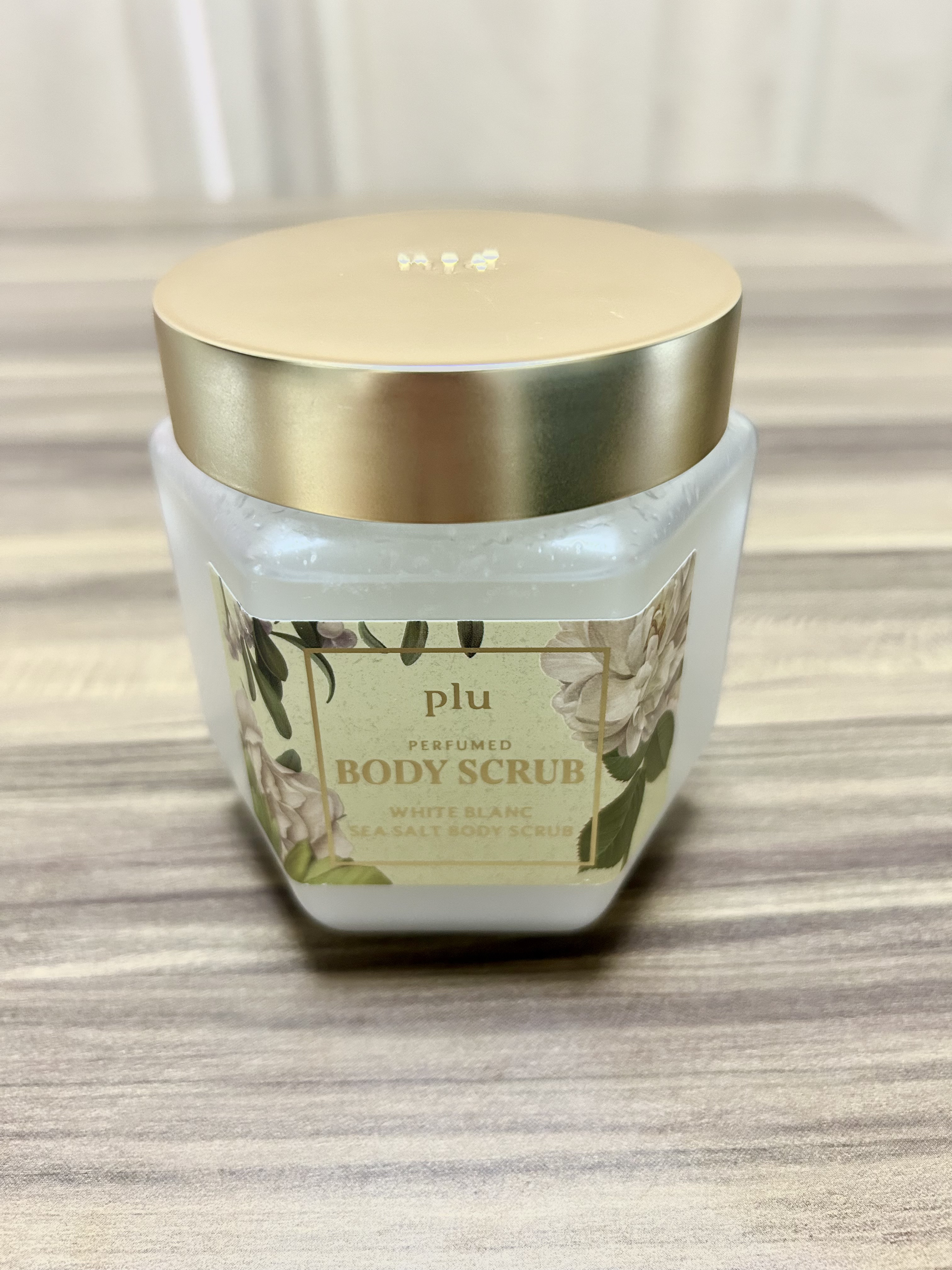 plu(プル)パフュームドボディスクラブホワイトブラン✨ボディスクラブで角質ケアと保湿ケアを同時に♪乾燥してゴワついた肌に潤いを与えるシーソルトスクラブ×植物由来オイルで出来たヴィーガンボディスクラブ💡かわいい♡高級感があるデザインガラスの瓶...