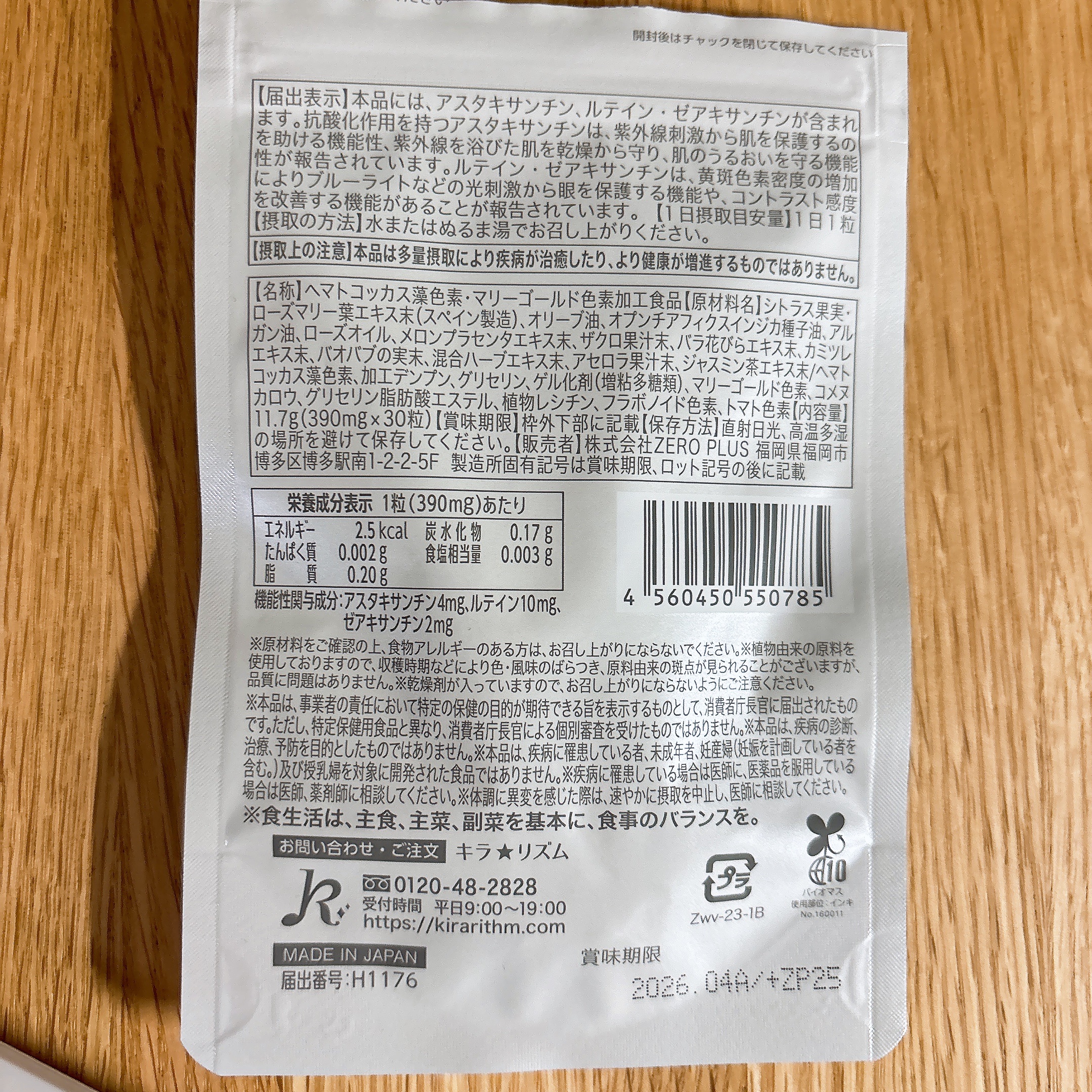 - 機能性関与成分:アスタキサンチン4mg、ルテイン10mg、ゼアキサンチン2mg シトラス果実・ローズマリー葉エキス末(スペイン製造)、オリーブ油、オプンチアフィクスインジカ種子油、 アルガン油、ローズオイル、メロンプラセンタエキス末、ザクロ果汁末、バラ花びらエキス末、カミツレエキス末、バオバブの実末、混合ハーブエキス末、アセロラ果汁末、ジャスミン茶エキス末/ヘマトコッカス藻色素、加工デンプン、グリセリン、ゲル化剤(増粘多糖類)、マリーゴールド色素、コメヌカロウ、グリセリン脂肪酸エステル、植物レシチン、フラボノイド色素、トマト色素