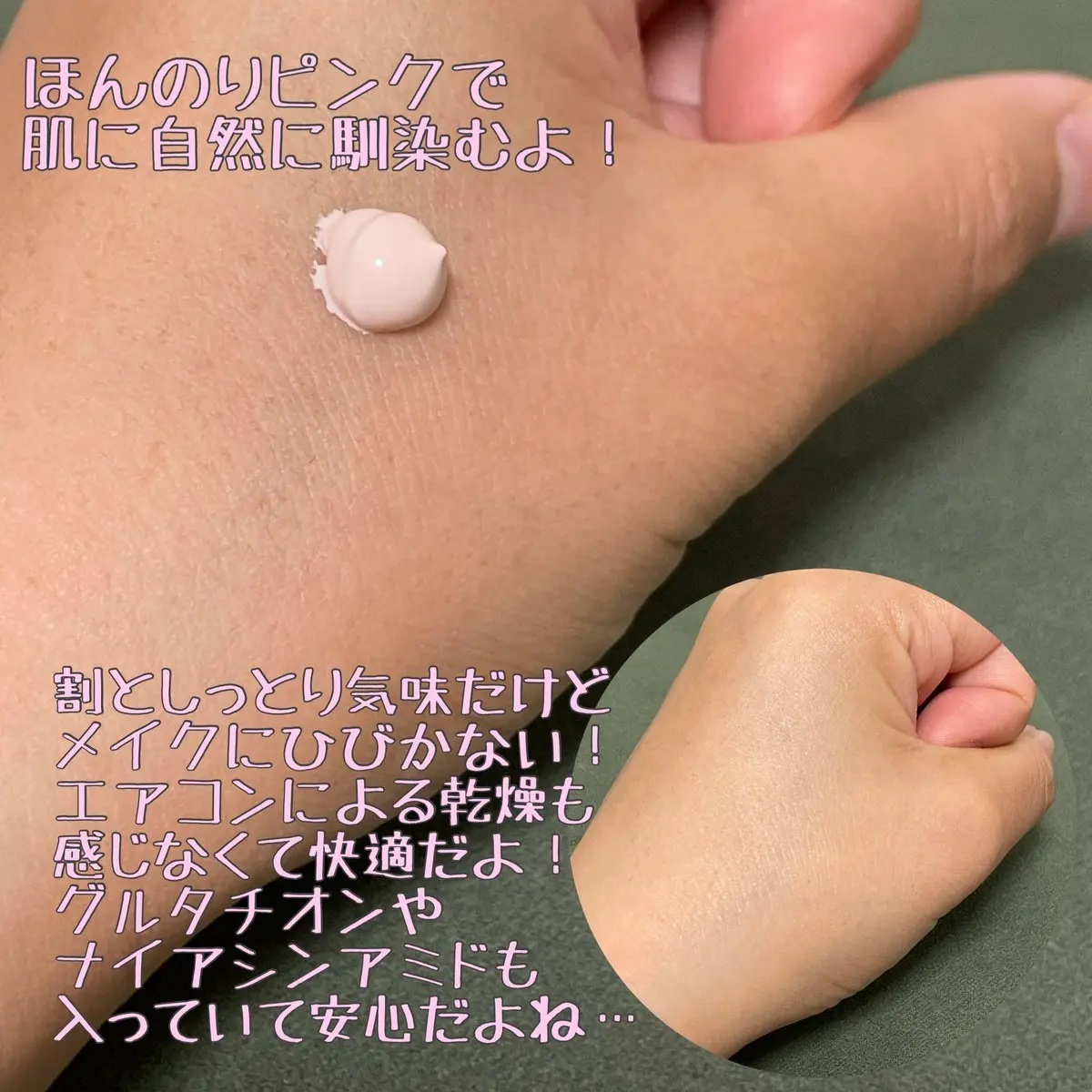 - SPF50+ PA++++ グルタチオン*やナイアシンアミド*が入った、スキンケア効果の高い、化粧下地としても使える日焼け止めです。 さらに、ヒアルロン酸*も入っているので、水分ケアまで可能!冬場でも、長時間乾燥が気になりにくい! スキンケアで肌を潤わしながら、日焼け対策もでき、化粧下地としてベースを整えてくれます。 しっとりとしたテクスチャーですが、仕上がりはベタっとせず、肌の角質層を潤わせるので、メイクの密着力を高め、長時間潤いを感じます。 ほんのりピンクがかった色で、肌に高級感と多幸感を演出してくれます。 *整肌成分