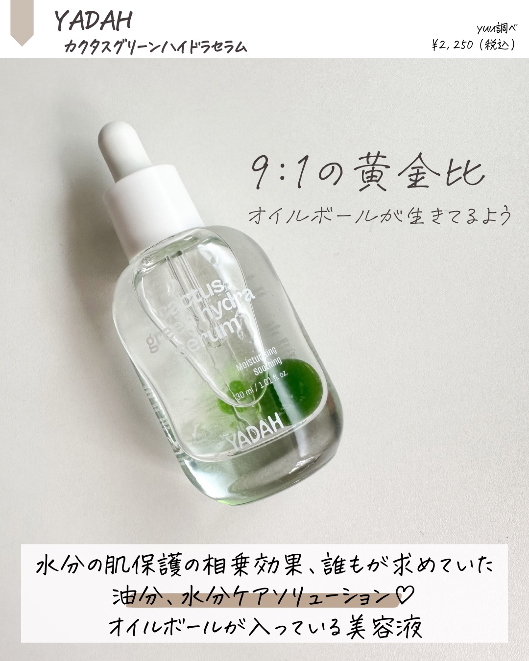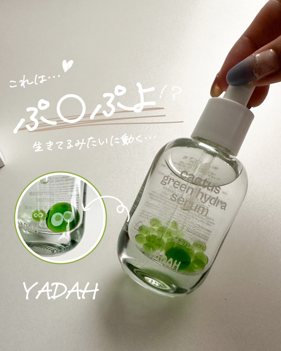 YADAH(ヤダー)カクタスグリーンハイドラセラム。見た目がとても綺麗で、みてるだけで癒される。水分、肌保護の相乗効果で油分、水分ケアができるみたい。ベタつかずに素早く肌に馴染んで、重くなくサラッとした付け心地みたいですよ。オイルボールが、保...