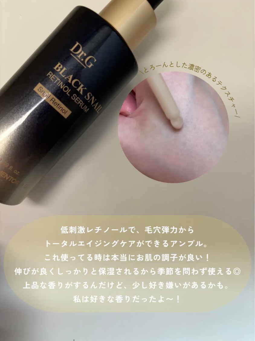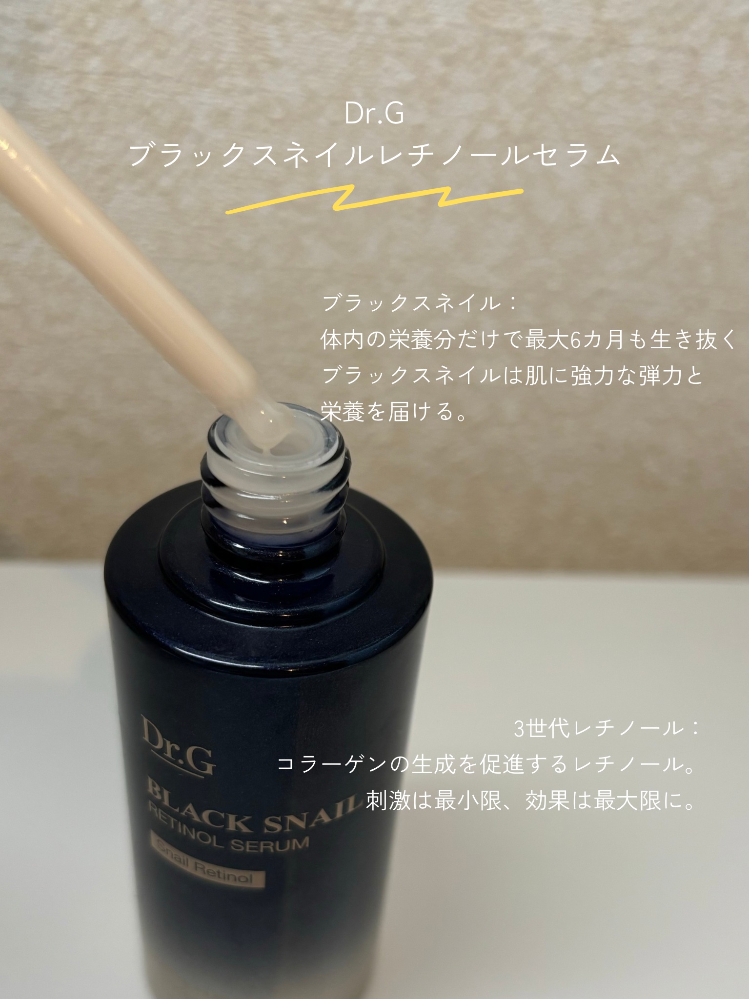 - ブラックスネイル*とレチノール*を配合した、若々しい肌印象に導く美容液です。 Dr.Gのレチノールは独自の成分である、ブラックスネイルレチノール*を使っています! 肌に高い保湿感を与え、肌のキメを整え、弾力やハリのケアを助けるだけでなく、肌の乾燥くすみをケアし、明るい印象のぷるんっとハリのある肌に導きます。 *整肌成分