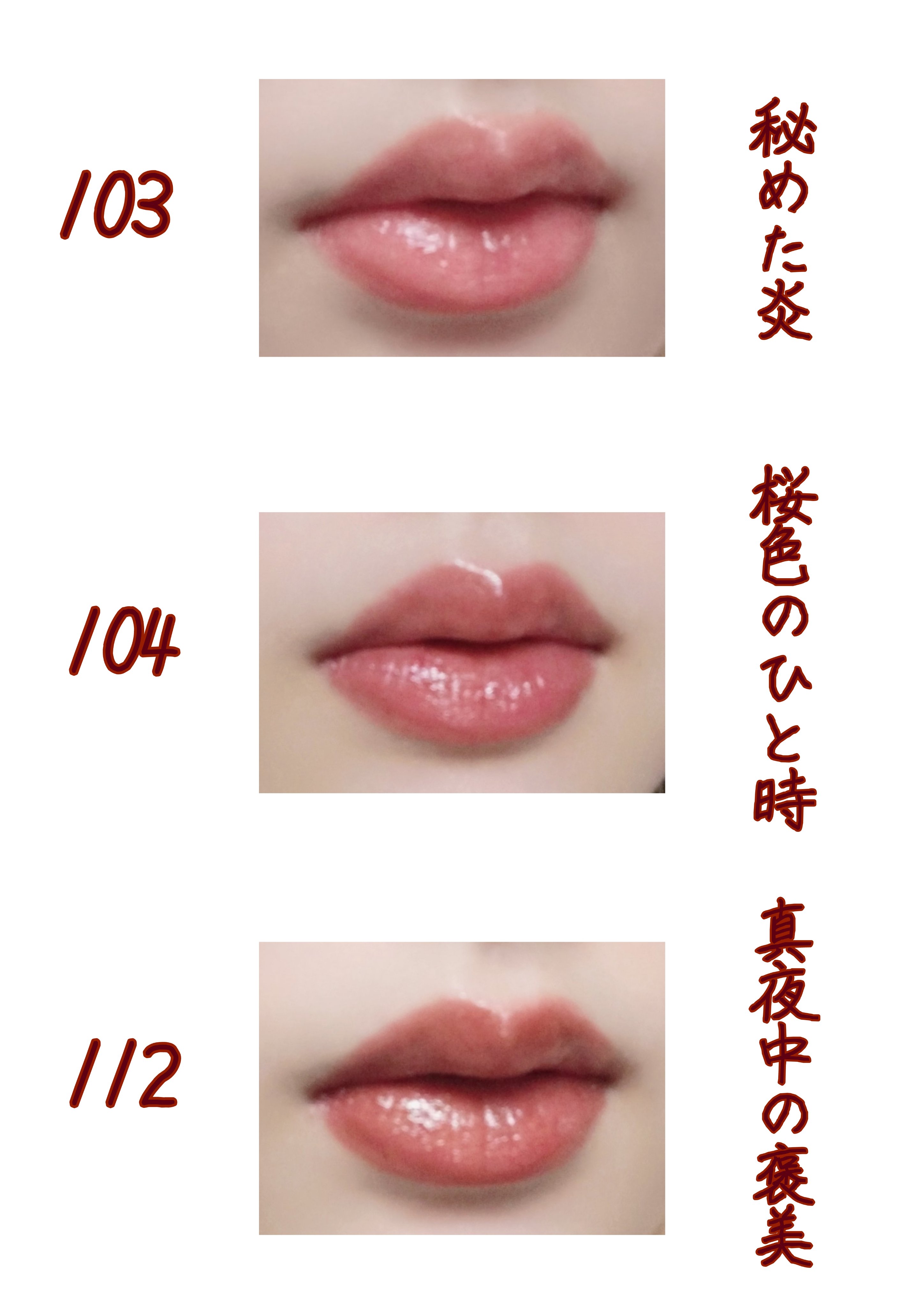 103秘めた炎 粘膜っぽさのある可憐なピンク。 104桜色のひと時 くすみ感のあるオールドピンクは桜のように優美で儚げ。 112真夜中の褒美 上品で深みのあるレッドブラウンの中にグリーンのパールがザックザクに入っていて、まるで聖夜に輝くイルミネーションのよう。