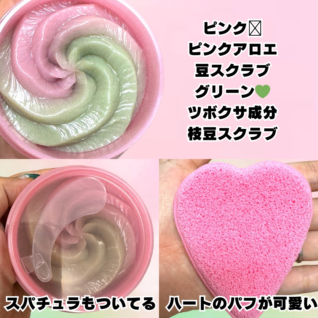 4in1の新感覚メレンゲクレンザー🎀ˊ˗ ピンクと黄緑の2色になっててスクラブが入ってるけど粒が小さいから塗布してるときに痛くないのが嬉しい🌸 洗い上がりはしっとりしてて乾燥感やピリつきを感じないのが◎ スクラブが苦手な人は泡立てネットで先に泡立てるときめ細かい泡になってスクラブのザラザラ感がなくなるからオススメ🕊️