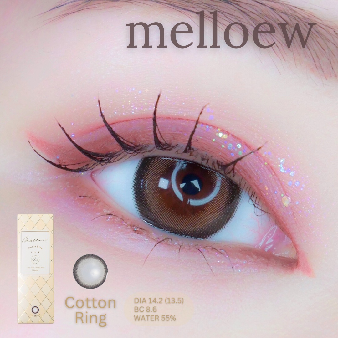 - ※2025年6月以降、商品パッケージ裏面・側面の一部表記を順次変更いたします。尚、これにかかる商品の交換・返品は承っておりません。 ふわっと漂う多幸感 キラキラとした瞳 そんな多くの人が憧れる印象はmelloewで作れる! 王道盛れからあざと盛れまでどんな盛れも叶うラインナップで瞳をコーディネート☆ Cotton Ring(コットンリング) DIA14.2㎜/着色直径13.5㎜ 溶け込みベージュ×くっきりフチ 写真でもリアルでも盛れちゃう♪ Silky Pearl(シルキーパール) DIA14.2㎜/着色直径13.5㎜ ツヤっぽベージュ×細フチ 垢抜けた印象にしたい方におすすめ♪ Truffle Gray(トリュフグレー) DIA14.2㎜/着色直径13.4㎜ おしゃれモテ♡ 濃いめグレージュ×ぼかし細フチ 品よく盛れるお嬢様な瞳に Pure Nude(ピュアヌード) DIA14.2㎜/着色直径13.2㎜ 絶妙ヌーディカラー×グラデフチ お仕事やカラコン初心者にもおすすめ♪ Brown Chou(ブラウンシュー) DIA14.2㎜/着色直径13.6㎜ まろやかブラウン×ぼかしフチ 日常使いにもおすすめ♪ Mocha Powder(モカパウダー) DIA14.2㎜/着色直径13.6㎜ リピ確モテ♡ ふわふわモカ×くりっとフチ 絶対盛れちゃう甘い瞳に Love Cacao(ラブカカオ) DIA14.2㎜/着色直径13.0㎜ 清楚モテ♡ とろふわチョコレート×こっそりフチ バレずに盛れちゃう瞳に カラーコンタクトレンズの不適正使用による眼障害の危険性等などがあります。 ●コンタクトレンズは高度管理医療機器です。不十分な洗浄・消毒など不適切なケアや、長時間・交換期間を超えた装用により、アレルギー性結膜炎、角膜感染症、角膜潰瘍等の重篤な眼障害が発生する危険性があります ●ご使用前に取扱説明書を確認してください 使用上の留意事項 ●眼科医院等を受診してからお求めください ●眼に異常を感じたら直ちにレンズ使用を中止し、お近くの眼科等で診察を受けてください ●医師の指示にしたがってご使用ください ●コンタクトレンズを装用する場合、自覚症状がなくても、眼科医院等での定期検査を受けてください ●レンズに不具合がある場合は使用しないでください