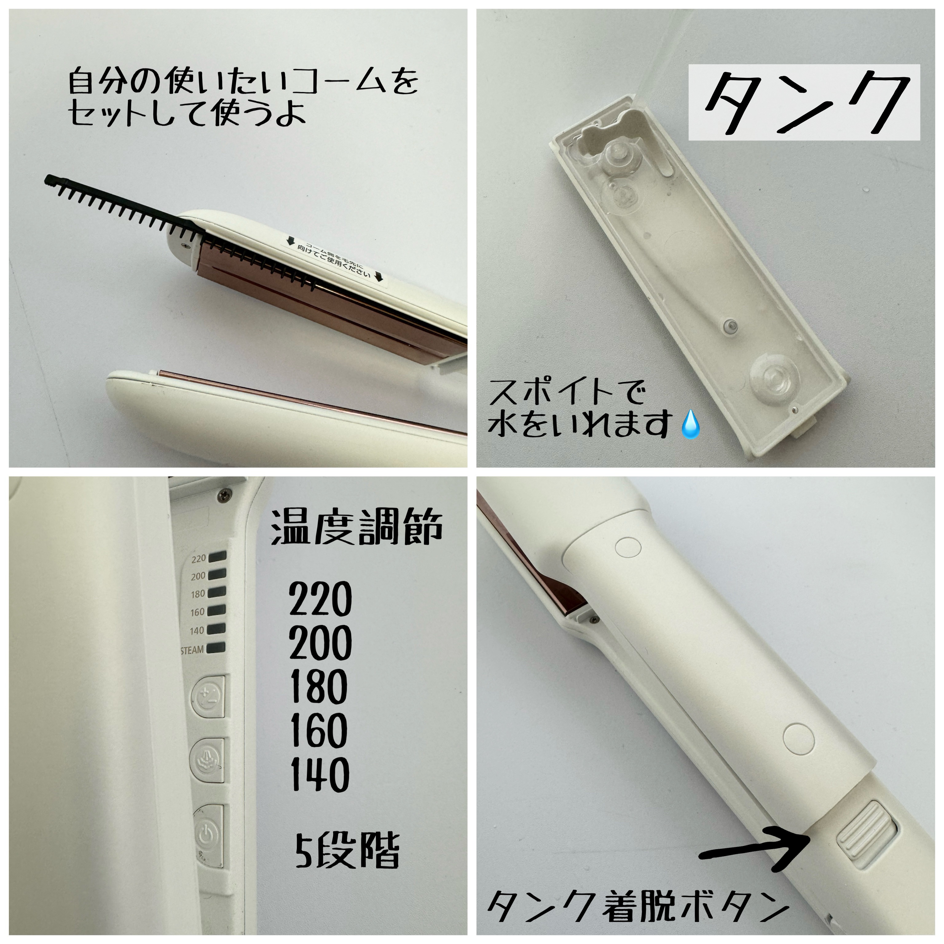 自分の好みで5段階から選べる髪の毛にかかるテンション(上下プレートの間隔)と80℃、100℃、120℃、140℃、160℃、180℃、200℃の7段階から選べる温度調節機能はとっても魅力的なポイントです😄💗✨ 本体の立ち上がりが速くヘアセットを急いでいる時でもサクッと使用できてありがたいです😉💓 何度してみても感動の使い心地でお家でヘアサロン級のセットを叶えてくれるからもう手放す事ができない私の相棒ちゃんです😘✨