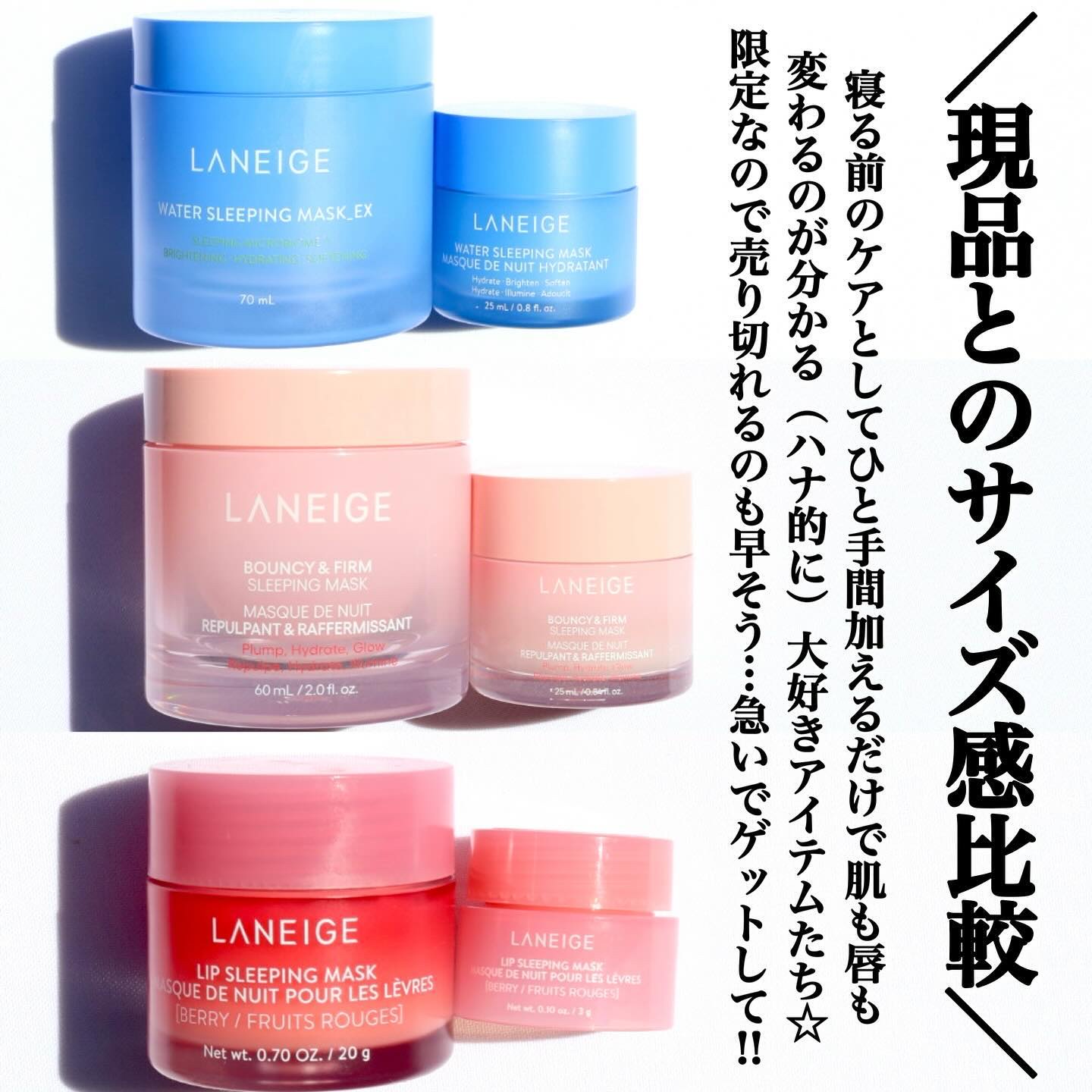 - 〈数量限定〉内容 ・バウンシースリーピングマスク 25mL(ミニサイズ) 塗って寝るだけの簡単ケアで、翌朝キュッと引き締まった、毛穴の目立ちにくい #ぷるつや肌*⁵ を目指せるフェイス用スリーピングマスク。 ピオニー&コラーゲンコンプレックス*⁶やペプチド*⁷、さらに約45,000個ものセラミドカプセル*⁸を配合し、毛穴とハリ不足を全方位からケアします。 商品名:バウンシースリーピングマスク/キット容量:25mL(ミニサイズ) ・ウォータースリーピングマスク 25mL(ミニサイズ) 塗って寝るだけの簡単ケアで、翌朝みずみずしくツヤのある明るい印象の肌へ導くフェイス用スリーピングマスク。 プロバイオティクスコンプレックス*⁹配合で睡眠中の肌を集中保湿ケアし、日中の紫外線や乾燥などのダメージを受けた肌の水分油分のバランスを整えます。 商品名:ウォータースリーピングマスク/キット容量:25mL(ミニサイズ) ・リップスリーピングマスク ベリー 3g(ミニサイズ) 塗って寝るだけで、翌朝ぷるんとした #ベイビーリップ に導くリップ用スリーピングマスク。 保湿成分ベリーフルーツコンプレックス*¹⁰やヤシ油を配合。マイルドに角質ケアしながらうるおいを与え、ツヤのあるふっくらした唇に導きます。 商品名:リップスリーピングマスク ベリー/キット容量:3g(ミニサイズ) *⁵ 保湿効果による *⁶シャクヤク花エキス、シャクヤク根エキス、加水分解コラーゲン(整肌うるおい保持成分) *⁷ アセチルテトラペプチド-2 (整肌うるおい保持成分) *⁸ ヒドロキシプロピルビスパルミタミドMEA(整肌うるおい保持成分) *⁹ 乳酸桿菌培養溶解質、トレハロース(すべてうるおい保持成分)*¹⁰ ザクロ果汁、ブドウ果汁、キイチゴ果汁