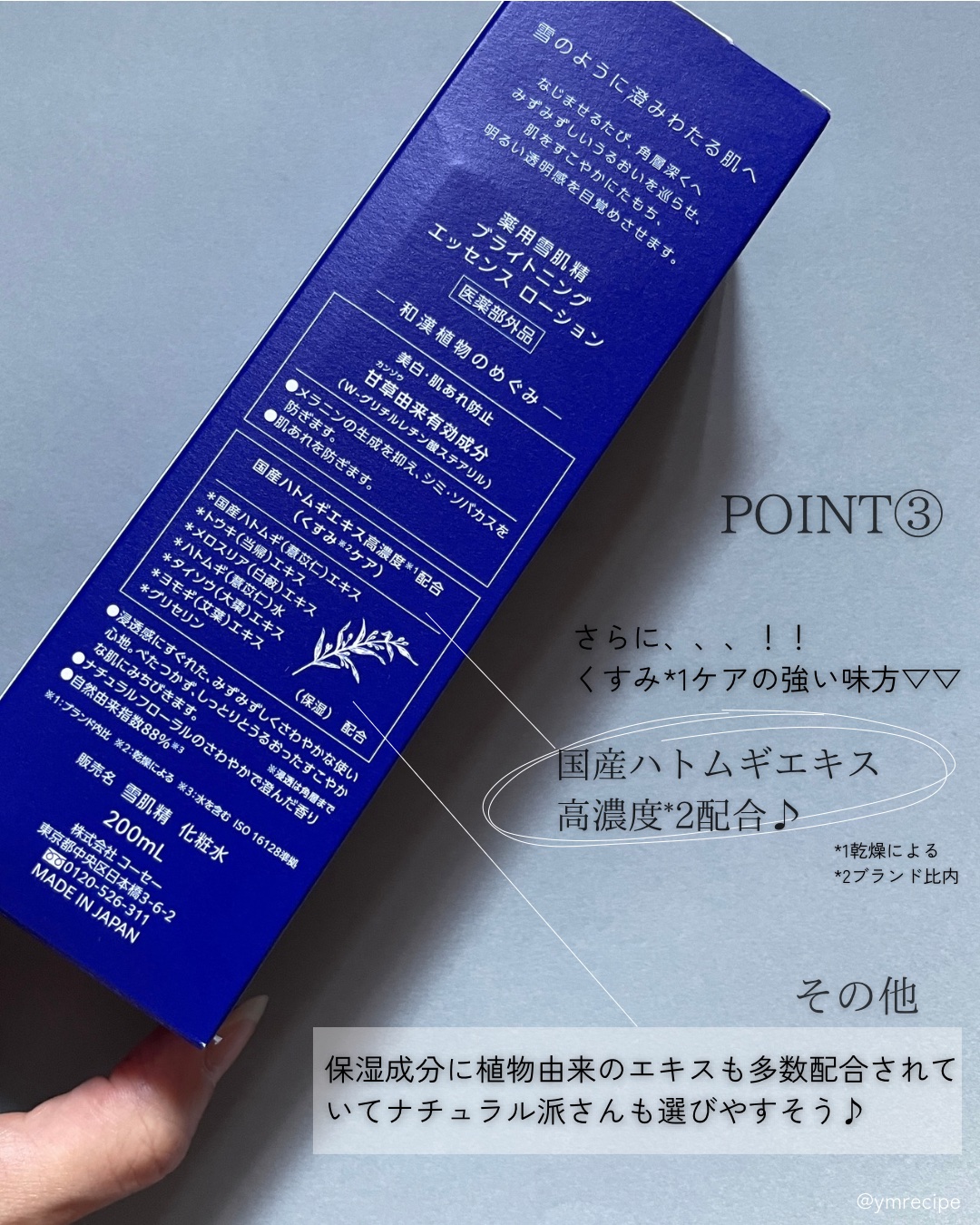 - 【医薬部外品】 みずみずしい透明素肌へと導く薬用美白化粧水。 美白・肌あれ防止の甘草由来有効成分(W-グリチルレチン酸ステアリル(※16))配合。 国産ハトムギエキス(保湿)を高濃度(※17)に配合し、肌本来の透明感を引き出します。 なじませるたび、角層深くへみずみずしいうるおいを巡らせ、肌をすこやかにたもち、明るい透明感を目覚めさせます。 ・メラニンの生成を抑え、シミ・ソバカスを防ぎます。 ・肌あれを防ぎます。 ・にきびを防ぎます。 ・日やけ、雪やけ後のほてりを防ぎます。 ・かみそりまけを防ぎます。 (※16)グリチルレチン酸ステアリルSW (※17)ブランド内比 <つめかえ用キット (310ml+24ml+10g):セット内容> ・薬用雪肌精 ブライトニング エッセンス ローション (つめかえ用レフィル) 310ml ・薬用雪肌精 ブライトニング エマルジョン 24ml ・薬用雪肌精 ブライトニング クリーム 10g ※セット商品の成分につきましては各商品ページでご確認ください。 <キット 2 (200ml+10g)(限定):セット内容> ・薬用雪肌精 ブライトニング エッセンス ローション 200ml ・薬用雪肌精 ブライトニング クリーム 10g ※セット商品の成分につきましては各商品ページでご確認ください。 <キット(200ml+24ml)(限定):セット内容> ・薬用雪肌精 ブライトニング エッセンス ローション 200ml ・薬用雪肌精 ブライトニング エマルジョン 24ml ※セット商品の成分につきましては各商品ページでご確認ください。