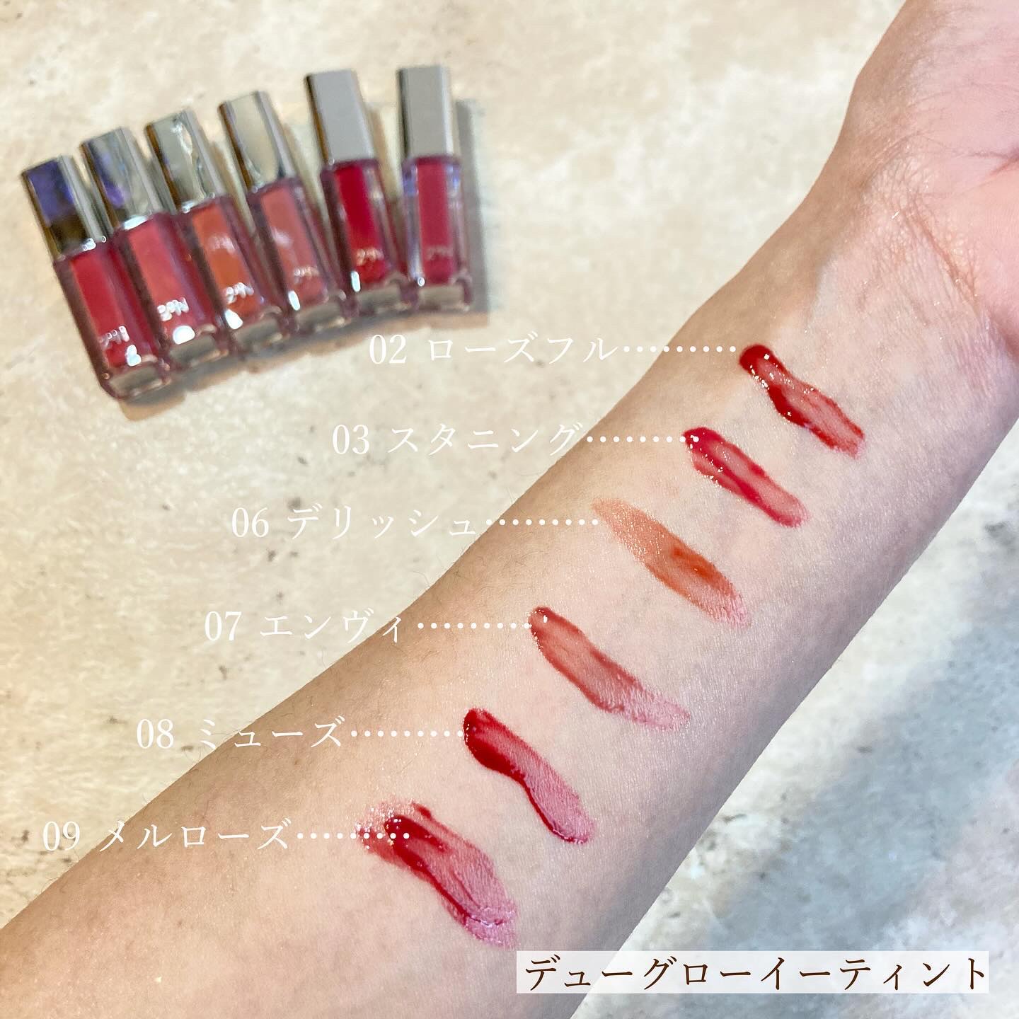 ふわっとしまマットカラーは馴染みが良い! 繊細な輝きのラメとの相性がすごく良い♡ 透明でナチュラルに発色されるカラーと ぷっくりみずみずしいツヤ感が叶うティント! 02は特に色んな方におすすめの万能チークらしいので悩んだらまずはこのカラーがオススメ!