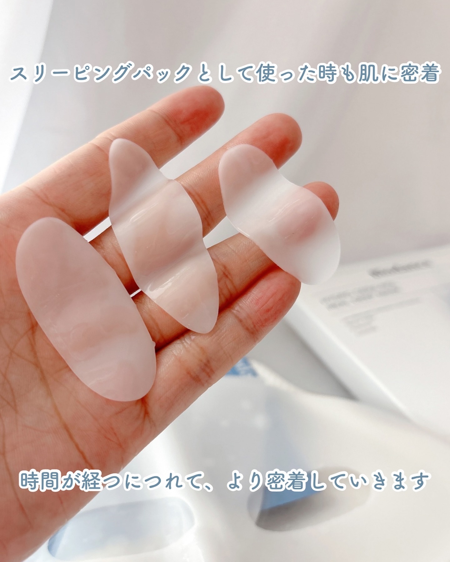ハイドロゲルタイプのマスク!! 最低3時間使用のスリーピングパック✨ 時間の経過とともに、美容液がお肌に吸収され 乳白色だったシートが透明に変わります。 お肌に貼り付けた時のひんやり感が気持ち良いです♫ 朝起きて剥がす時が私は楽しいです♫