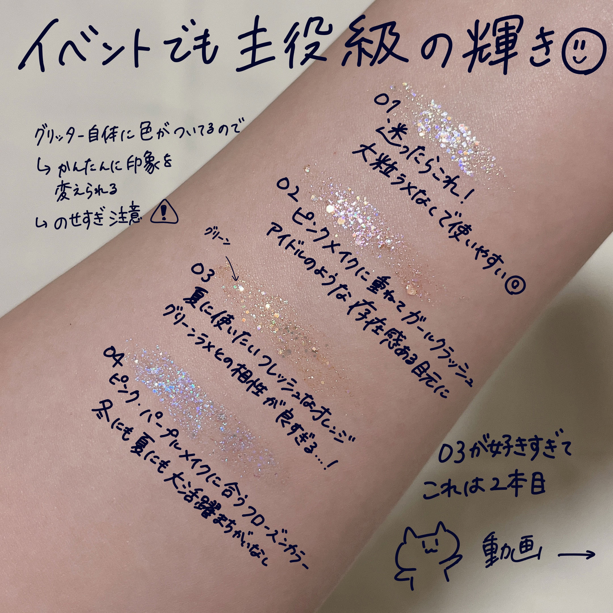 温かみのある多色ラメのグリッターです。黄味寄りで、クリアなベージュ系ベースと少しシルバーも入ったような多色ラメなのでパーソナルカラー問わず使える色味かなと思いました。 瞼や手が動いた時の方がめちゃくちゃキラキラしててラメの光具合が絶妙に可愛いです✨ 01のムーンライトが1番使いやすいかなと思いました😊💓 少し暗いところで見ると繊細な多色ラメがキラキラして凄く可愛いので映画館や水族館、イルミネーションなどに付けて行くのもオススメです❣️