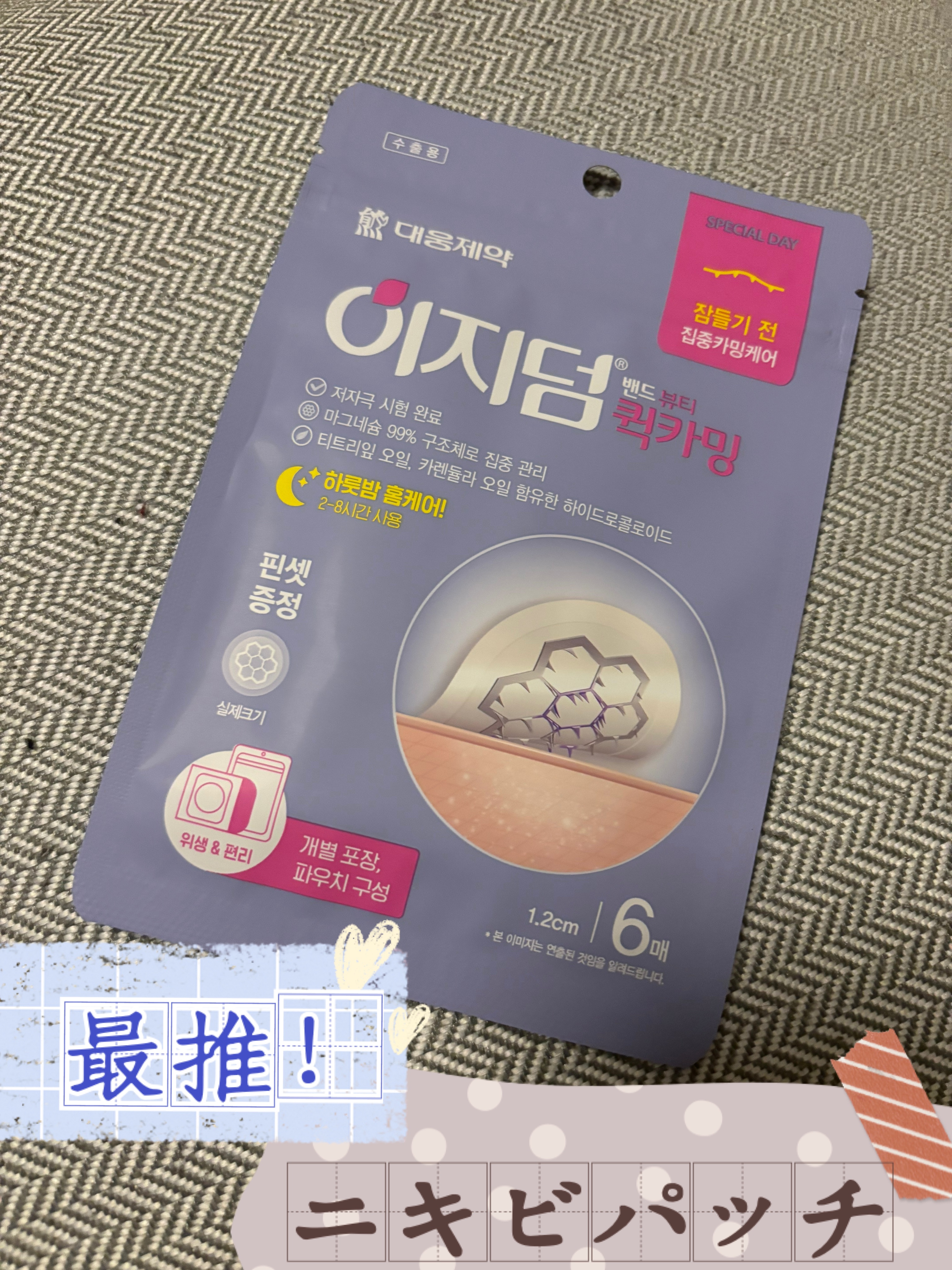 ニキビが潰れてしまった後に貼る、ニキビパッチです! 私は夜のスキンケアが全部終わって、ベタベタしなくなった後に貼っています! 密着力が高くて、朝になっても剥がれてなかったので、お気に入りです! 鍼がついているニキビパッチで、よりしっかりケアしたい方におすすめです!