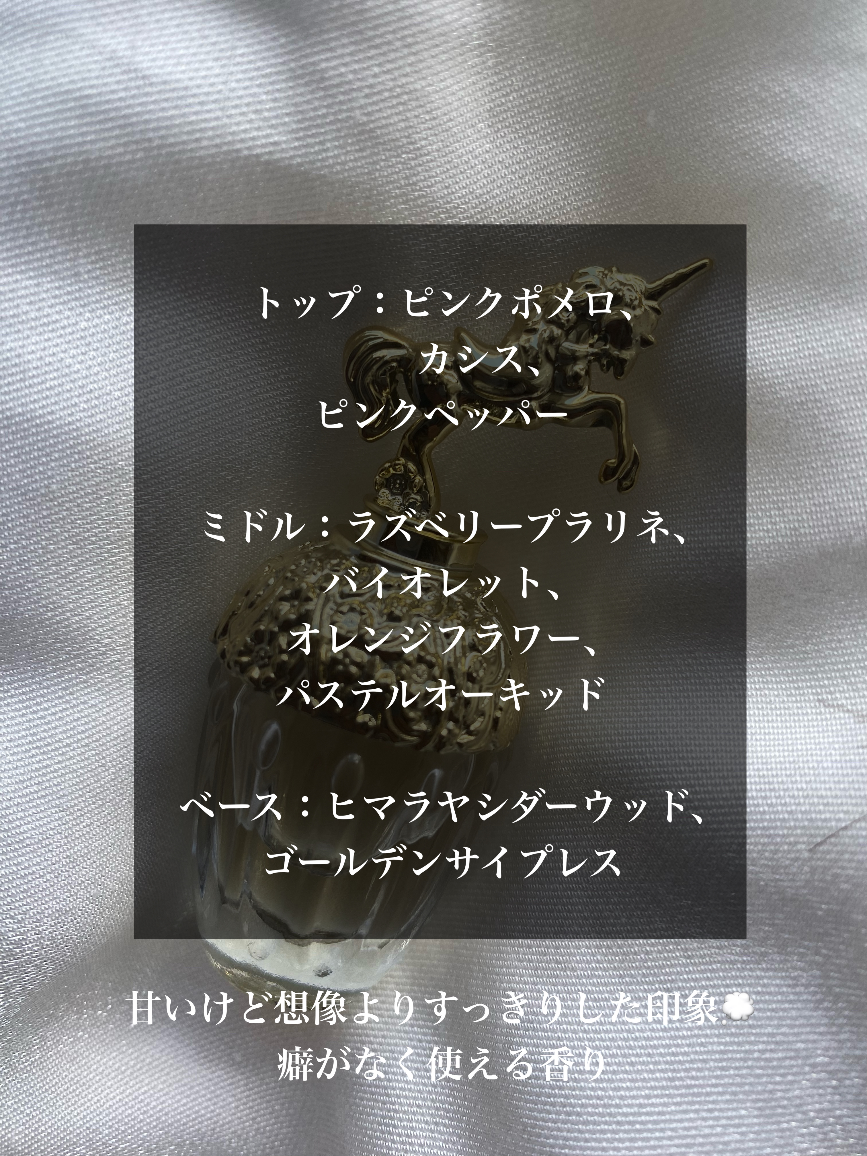 - ロマンティックな魔法で新しい世界が廻りだす ●アナスイが幼少時代、偶然街中で出会ったメリーゴーランドのユニコーンからインスパイアされた、ファンタジーの世界へ誘うフレグランス。 ●甘くミステリアスでありながら、はじけるような香り。 【香調】ウッディフルーティフローラル <TOP>ピンクポメロ、カシス、ピンクペッパー <MIDDLE>ラズベリープラリネ、バイオレット、オレンジフラワー、パステルオーキッド <BASE>ヒマラヤシダ―ウッド、ゴールデンサイプレス