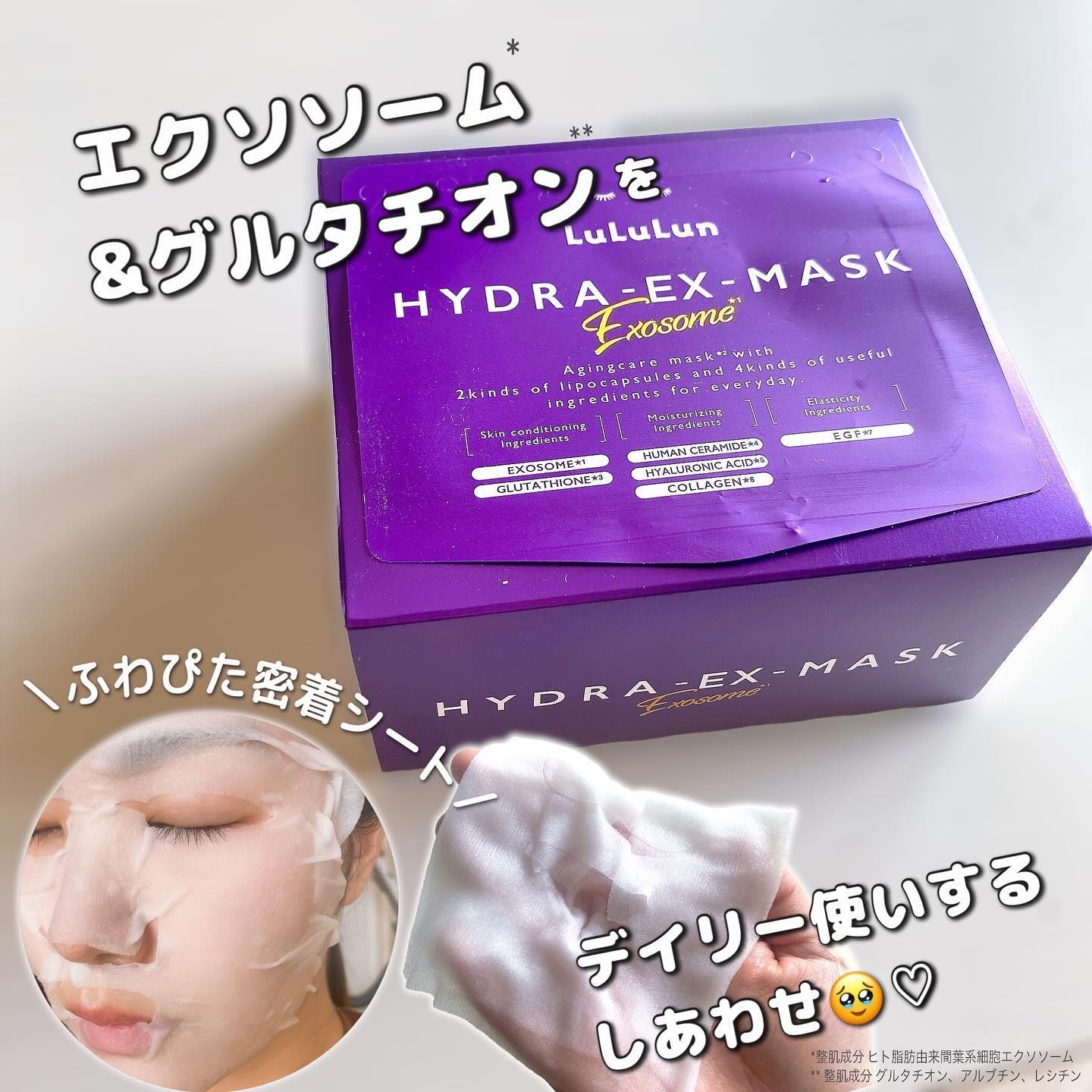 ルルルンの毎日の化粧水の代わりに使える、成分設計にこだわったうるおい+αのフェイスマスク、ハイドラEXマスクは発売してからSNS中心にバズってなかなか購入できなかったですよね😭💦 こちらはエクソソームとの組み合わせによる相乗効果に着目し、ツヤめく白玉肌へと導きます。 密着力の高いやわらかなシートになっていて、効果だけでなく、使い心地も最高です🫶💜