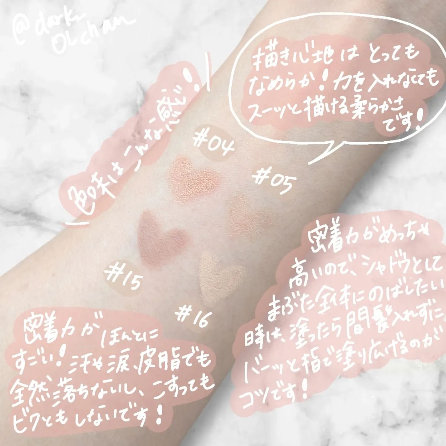 ホワイトパッケージに装いを新たに 既存に比べてより長持ち、よりなめらかなテクスチャーへ 15色のカラー展開でアイライナー・シャドウ・涙袋・グリッターに使える万能アイテム🪄 水・汗・摩擦に強く、擦っても滲まない それでいて、クレンジングでするっと落ちる