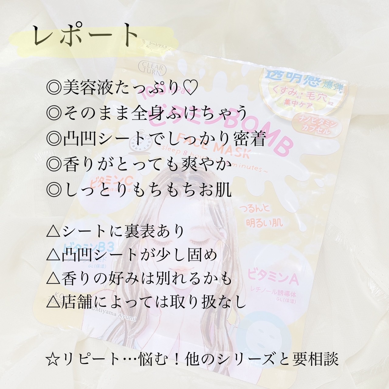 〜8分の集中ケアで8時間熟睡したような肌に〜◆クリアターンビタミンBOMBマスク7枚入り 660円パケがかわいくてよくみるパックピンクのごめんね素肌マスクを使ってて良かったので今回は黄色のこちらを買ってみました🛒まるで透明感爆弾多種のビタミ...