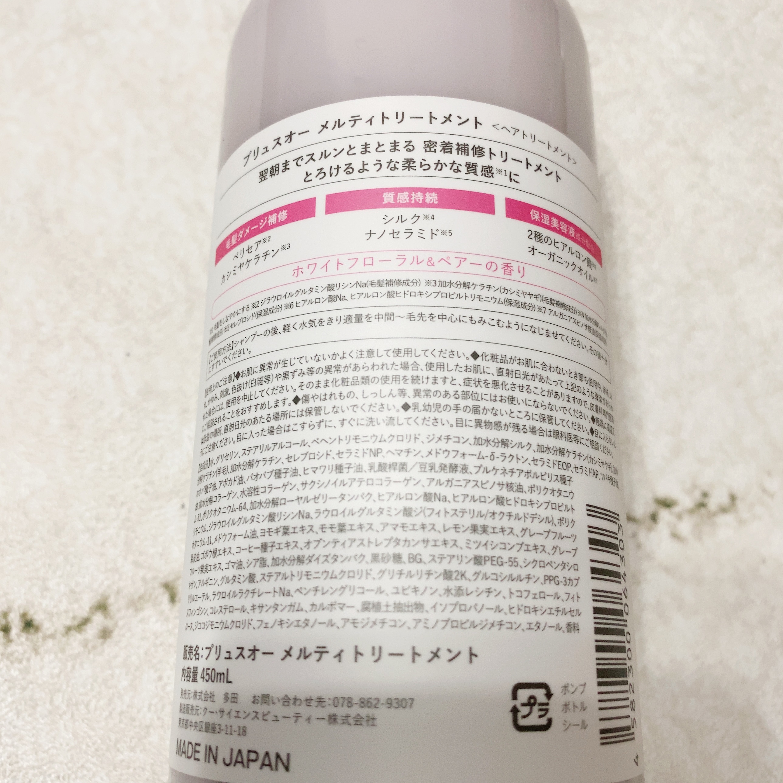 - <メルティシャンプー> 水、グリセリン、コカミドプロピルベタイン、ラウラミドDEA、ココイルメチルタウリンNa、コカミドDEA、ラウロイルメチルアラニンNa、ココイル加水分解コラーゲンK、ココイル加水分解ケラチンK、ココイルグリシンNa、加水分解ケラチン(カシミヤヤギ)、加水分解ケラチン(羊毛)、加水分解シルク、セレブロシド、セラミドNP、ヘマチン、メドウフォーム-δ-ラクトン、セラミドEOP、セラミドAP、ツボクサエキス、ジラウロイルグルタミン酸リシンNa、オプンティアストレプタカンサエキス、異性化糖、アルガニアスピノサ核油、ヒアルロン酸Na、ヒアルロン酸ヒドロキシプロピルトリモニウム、EDTA-3Na、加水分解ダイズタンパク、加水分解ローヤルゼリータンパク、ポリクオタニウム-10、ポリクオタニウム-7、アボカド油、バオバブ種子油、ポリクオタニウム-52、ヒマワリ種子油、ホホバ種子油、ヤシ油アルキルグルコシド、プロポリスエキス、シャクヤク根エキス、オタネニンジン根エキス、カミツレ花エキス、ハチミツ、ハチミツエキス、ローヤルゼリー、BG、ラウロイルラクチレートNa、ヤシ油脂肪酸PEG-7グリセリル、ジステアリン酸PEG-150、グリチルリチン酸2K、ラウロイルグルタミン酸ジ(フィトステリル/オクチルドデシル)、PEG-32、PEG-1ラウリルグリコール、トコフェロール、フィトスフィンゴシン、キサンタンガム、カルボマー、エチドロン酸、コレステロール、エチドロン酸4Na、クエン酸、メチルパラベン、エタノール、フェノキシエタノール、香料 <メルティトリートメント> 水、グリセリン、ステアリルアルコール、ベヘントリモニウムクロリド、ジメチコン、加水分解シルク、加水分解ケラチン(カシミヤヤギ)、加水分解ケラチン(羊毛)、加水分解ケラチン、セレブロシド、セラミドNP、ヘマチン、メドウフォーム-δ-ラクトン、セラミドEOP、セラミドAP、ツバキ種子油、ホホバ種子油、アボカド油、バオバブ種子油、ヒマワリ種子油、乳酸桿菌/豆乳発酵液、プルケネチアボルビリス種子油、加水分解コラーゲン、水溶性コラーゲン、サクシノイルアテロコラーゲン、アルガニアスピノサ核油、ポリクオタニウム-51、ポリクオタニウム-64、加水分解ローヤルゼリータンパク、ヒアルロン酸Na、ヒアルロン酸ヒドロキシプロピルトリモニウム、ジラウロイルグルタミン酸リシンNa、ラウロイルグルタミン酸ジ(フィトステリル/オクチルドデシル)、ポリクオタニウム-11、メドウフォーム油、ヨモギ葉エキス、モモ葉エキス、アマモエキス、レモン果実エキス、グレープフルーツ果皮油、ゴボウ根エキス、コーヒー種子エキス、オプンティアストレプタカンサエキス、ミツイシコンブエキス、グレープフルーツ果実エキス、ゴマ油、シア脂、加水分解ダイズタンパク、黒砂糖、BG、ステアリン酸PEG-55、シクロペンタシロキサン、アルギニン、グルタミン酸、ステアルトリモニウムクロリド、グリチルリチン酸2K、グルコシルルチン、PPG-3カプリリルエーテル、ラウロイルラクチレートNa、ペンチレングリコール、ユビキノン、水添レシチン、トコフェロール、フィトスフィンゴシン、コレステロール、キサンタンガム、カルボマー、腐植土抽出物、イソプロパノール、ヒドロキシエチルセルロース、ジココジモニウムクロリド、フェノキシエタノール、アモジメチコン、アミノプロピルジメチコン、エタノール、香料 <メルティシャンプー詰替> 水、グリセリン、コカミドプロピルベタイン、ラウラミドDEA、ココイルメチルタウリンNa、コカミドDEA、ラウロイルメチルアラニンNa、ココイル加水分解コラーゲンK、ココイル加水分解ケラチンK、ココイルグリシンNa、加水分解ケラチン(カシミヤヤギ)、加水分解ケラチン(羊毛)、加水分解シルク、セレブロシド、セラミドNP、ヘマチン、メドウフォーム-δ-ラクトン、セラミドEOP、セラミドAP、ツボクサエキス、ジラウロイルグルタミン酸リシンNa、オプンティアストレプタカンサエキス、異性化糖、アルガニアスピノサ核油、ヒアルロン酸Na、ヒアルロン酸ヒドロキシプロピルトリモニウム、EDTA-3Na、加水分解ダイズタンパク、加水分解ローヤルゼリータンパク、ポリクオタニウム-10、ポリクオタニウム-7、アボカド油、バオバブ種子油、ポリクオタニウム-52、ヒマワリ種子油、ホホバ種子油、ヤシ油アルキルグルコシド、プロポリスエキス、シャクヤク根エキス、オタネニンジン根エキス、カミツレ花エキス、ハチミツ、ハチミツエキス、ローヤルゼリー、BG、ラウロイルラクチレートNa、ヤシ油脂肪酸PEG-7グリセリル、ジステアリン酸PEG-150、グリチルリチン酸2K、ラウロイルグルタミン酸ジ(フィトステリル/オクチルドデシル)、PEG-32、PEG-1ラウリルグリコール、トコフェロール、フィトスフィンゴシン、キサンタンガム、カルボマー、エチドロン酸、コレステロール、エチドロン酸4Na、クエン酸、メチルパラベン、エタノール、フェノキシエタノール、香料 <メルティトリートメント詰