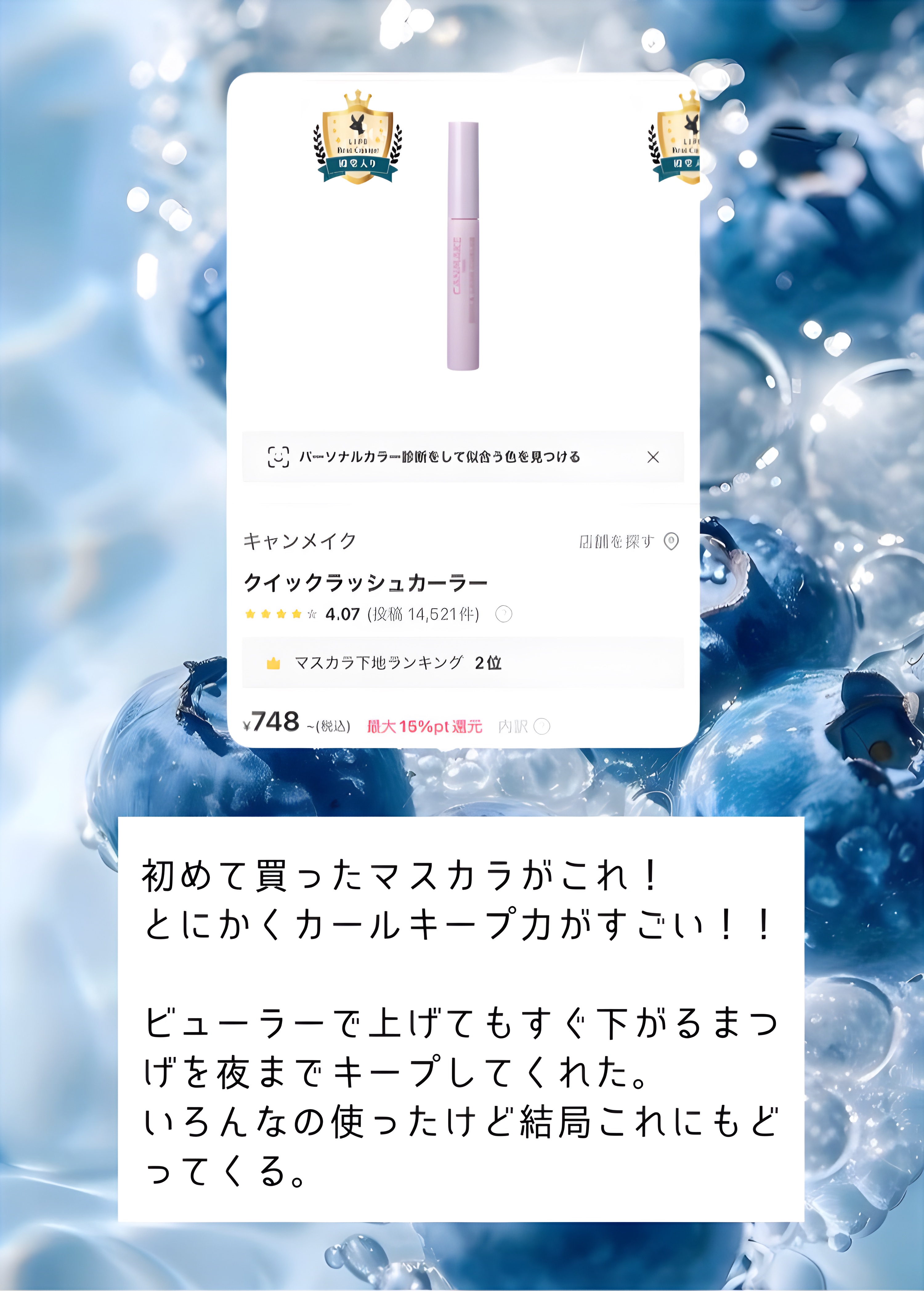 | マスカラランキング第61位 | 安すぎる!毎日使いでナチュラルにまつ毛をあげたい人に | 詳細を見る |