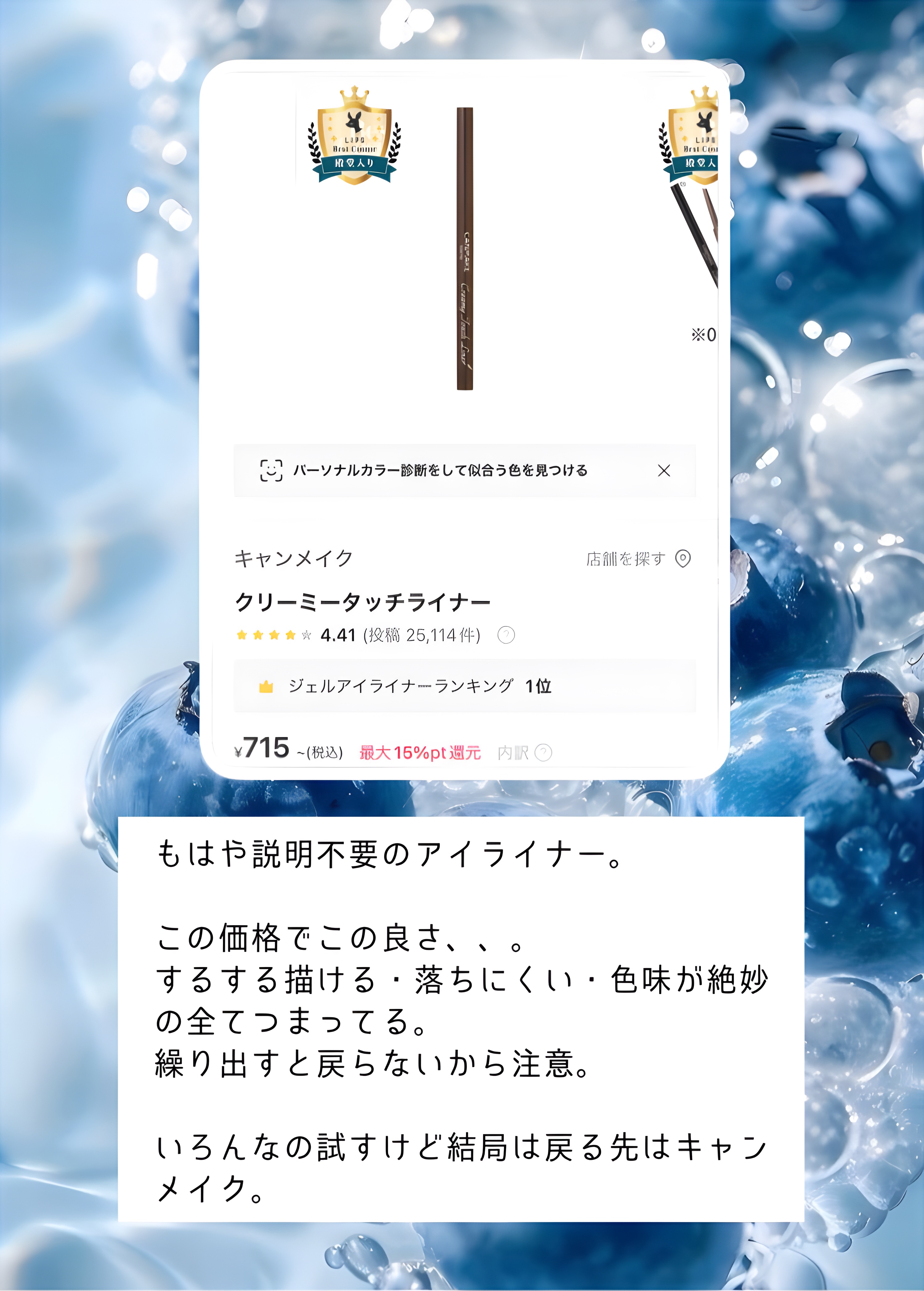 | ジェルアイライナーランキング第1位 | 濃厚発色、高密度、1.5mmの超極細ジェルアイライナー!長時間綺麗な仕上がりをキープ | 詳細を見る | |