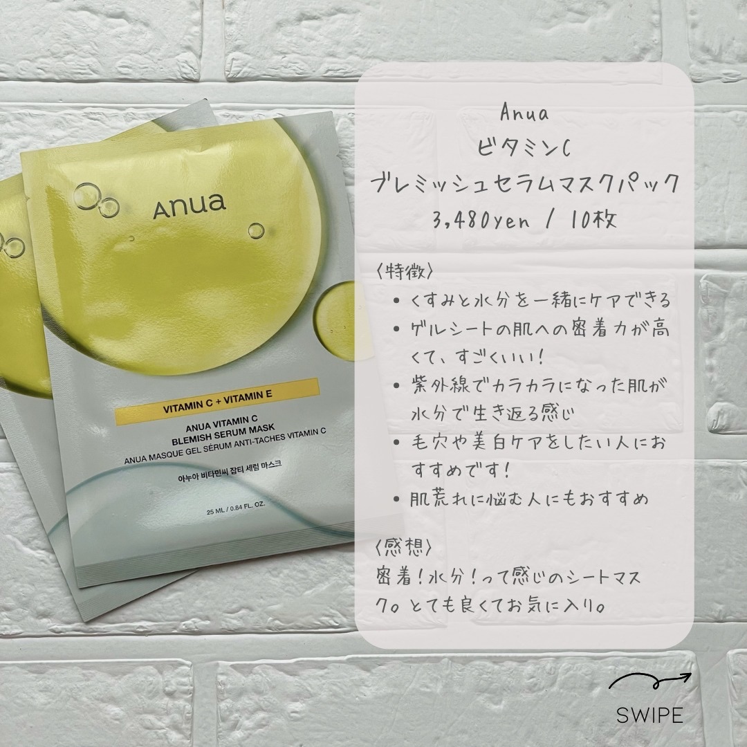 AnuaビタミンCブレミッシュセラムマスクパック薄めのシートでプルプル、ツヤツヤした感じのシートです。美容液もヒタヒタに含まれてます!少し薄めの黄色っぽい感じです🍋密着も良かったです!このタイプはツヤ、トーンに✨少し匂いが独特な感じの香りのよ...