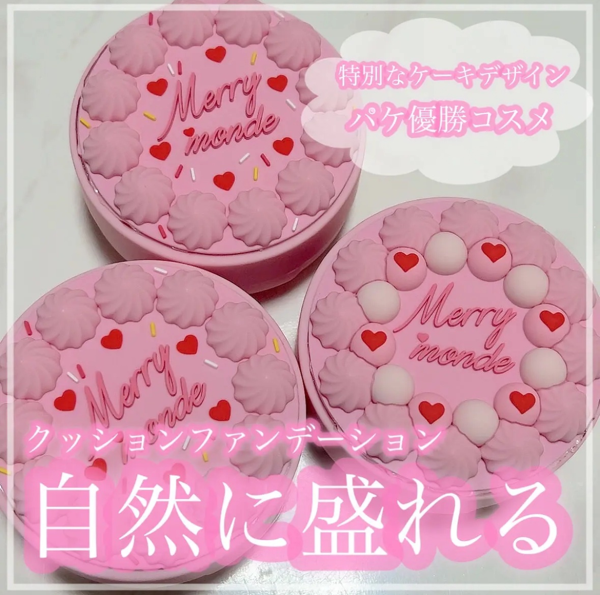 - SPF40PA++ 可愛さと製品力を兼ね備えたクッションファンデーション 「カバー力」「毛穴の凹凸」「軽さ」ケーキを連想させる特別なパッケージで視線をひきつけてプレゼントしやすいアイテムとして人気を集め、カカオプレゼントランキング1位を受賞、デザインだけでなく、韓国OEM・ODM最大手のCOSMAX(コスマックス)と共に単独開発した商品です。 ポイント1:アイデンティティなケーキのデザイン メリーモンドのユニークなアイデンティ「ケーキデザイン」は取り外し可能です #スペシャルデイ 童心に帰り、誰もが純粋な美しさを呼び覚まします。メリーモンドのクッションファンデで毎日があなたのハッピーバースデイ!ケーキのパーツは付け替え可能で、シンプルなパッケージとしてもお使い頂けます。 ポイント2:フィクシングシステム技術で薄膜を貼ったような、フォギーな仕上がり ポイント3:パーフェクトカバー、サラサラ、エアリーフェイットテクスチャー 毛穴の凹凸を綺麗にカバー、軽く密着し1日つけたてのようなお肌へ ポイント4:クリーンビューティ ヒノキ50,000pmとビーガン認証を取得 〈セット内容〉 本体1個(パッケージ+レフィル)、レフィル1個、パフ2個 2024年4月より全国のバラエティショップに販売スタート