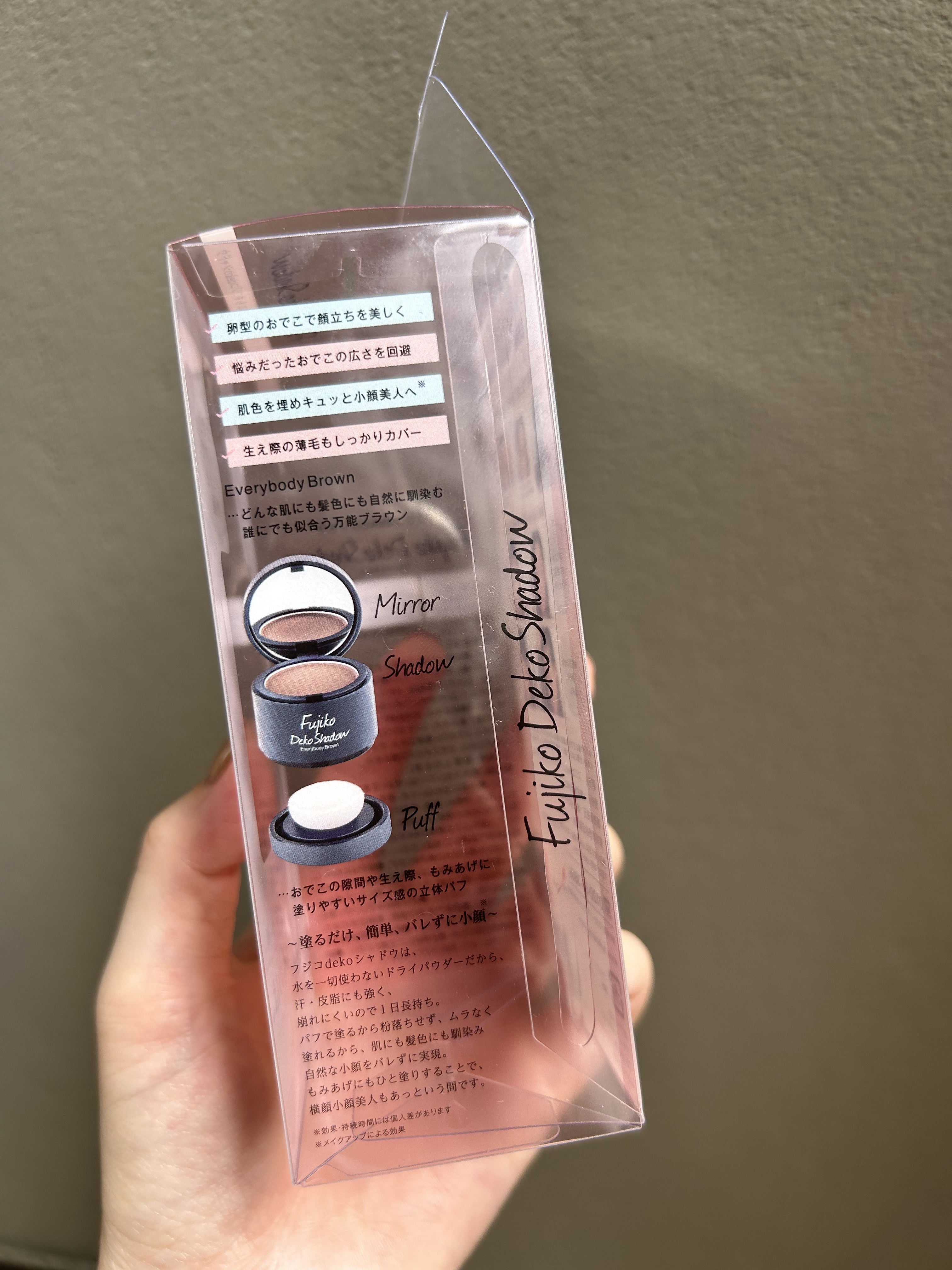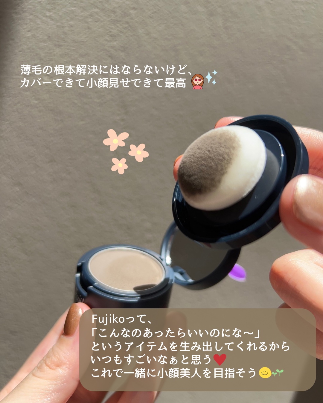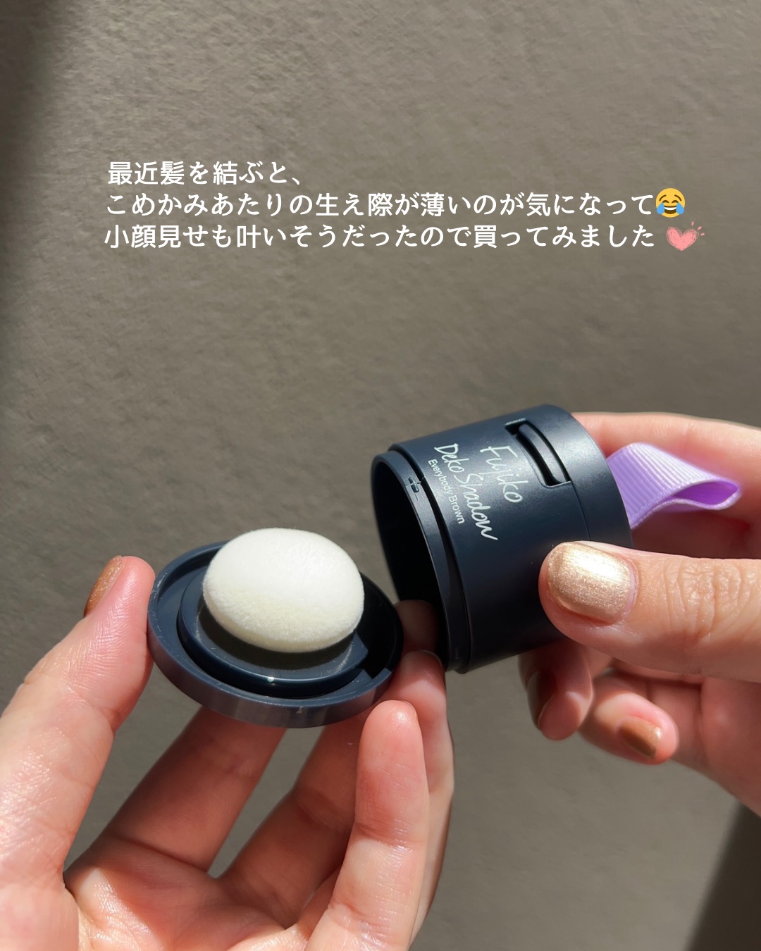 毎日メイクに欠かせないFujikoフジコdekoシャドウ¥1,870顔面短縮に劇的効果あり◎程よい色づきで、下のパフにとってかけるので手も汚れず楽ちん!シェーディングよりも色が濃いので、シェーディングよりも攻めて髪の生え際に増毛した感じにでき...
