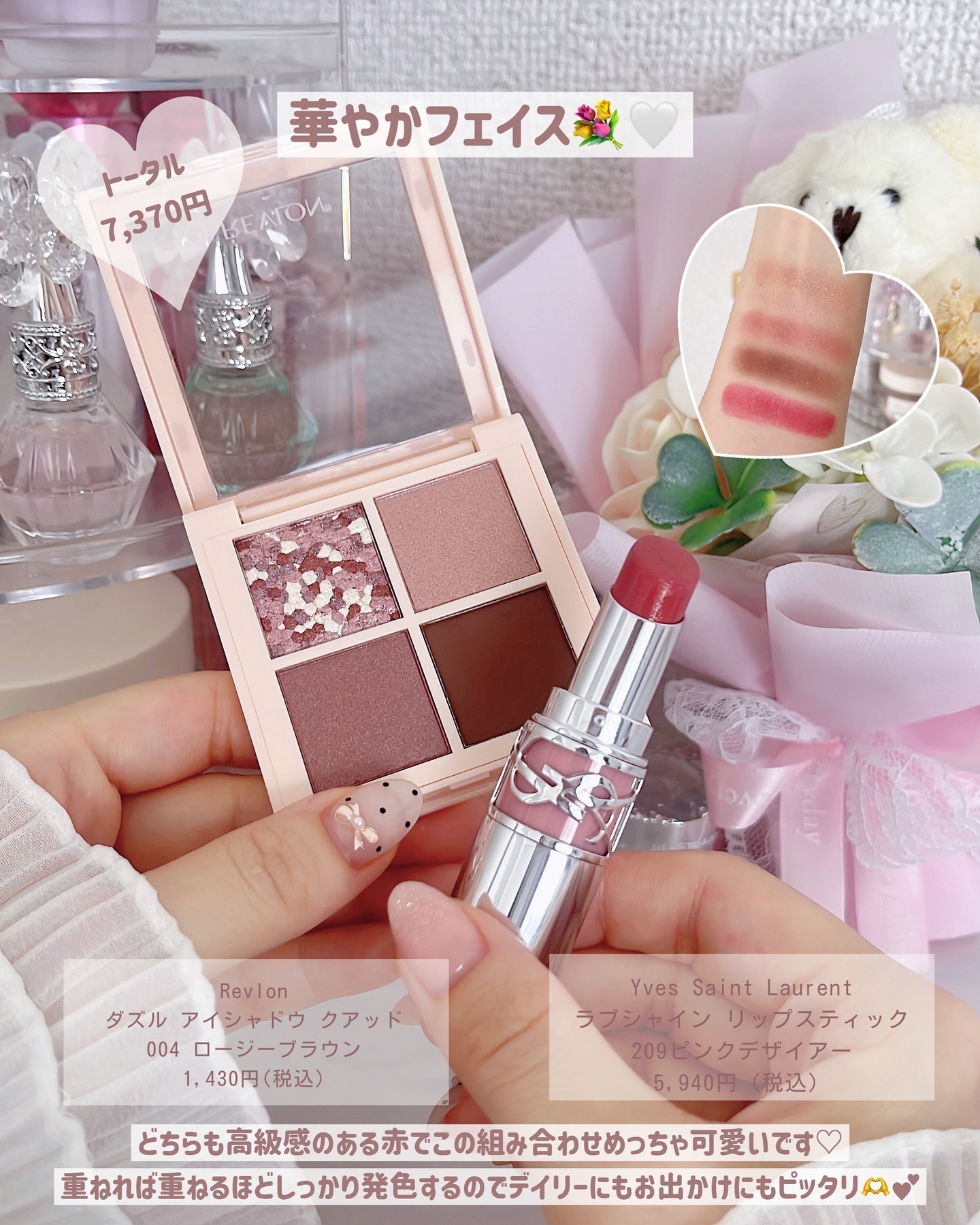 リップ&チーク<全3色> 1,650円→02Redを選びました アイシャドウ<全3色> 1,650円→03Burgundyを選びました リップ、アイシャドウはどちらもクリームタイプです。油分とっても多めなのでツヤ感出ます! チークは指塗りでもいいけど、ぜひミッフィースポンジを使おう!笑 リップとアイシャドウはブラシがないとぬりにくいかな アイシャドウはバーガンディなんですが、かなりブラウン寄りです。キラキララメが入っていて嬉しい♡
