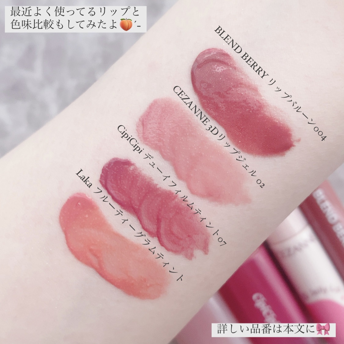 - <01 ピーチメルバ> ミネラルオイル、水添ポリイソブテン、マイクロクリスタリンワックス、リンゴ酸ジイソステアリル、ヒドロキシステアリン酸エチルヘキシル、パルミチン酸デキストリン、ジメチルシリル化シリカ、フェノキシエタノール、メチルパラベン、トコフェロール、シメチコン、水、BG、ユズ果実エキス、モウソウチクたけのこ皮エキス、チャ葉エキス、セイヨウハッカ葉エキス、酸化チタン、黄5、赤202、黄4、酸化鉄、ラウロイルリシン、赤104(1)、水酸化Al、シリカ <02 ミルクローズ> ミネラルオイル、水添ポリイソブテン、マイクロクリスタリンワックス、リンゴ酸ジイソステアリル、ヒドロキシステアリン酸エチルヘキシル、パルミチン酸デキストリン、ジメチルシリル化シリカ、フェノキシエタノール、メチルパラベン、トコフェロール、シメチコン、水、BG、ユズ果実エキス、モウソウチクたけのこ皮エキス、チャ葉エキス、セイヨウハッカ葉エキス、酸化チタン、黄5、赤202、青1、ラウロイルリシン、水酸化Al、酸化鉄、シリカ