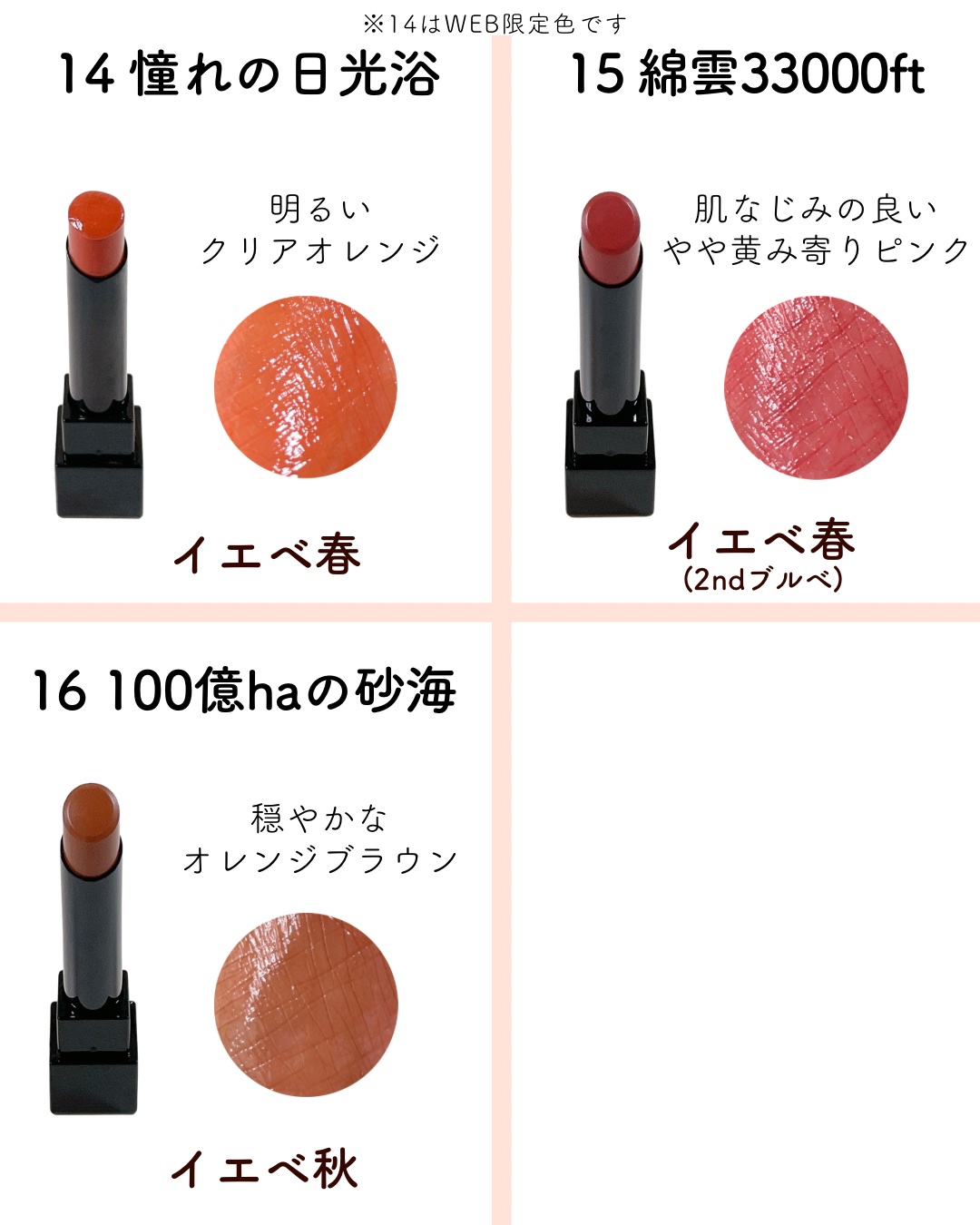 - <01 欲望の塊> テトライソステアリン酸ジペンタエリスリチル、トリ(カプリル酸/カプリン酸)グリセリル、オクチルドデカノール、ラウロイルグルタミン酸ジ(フィトステリル/オクチルドデシル)、ビスアルキル(C16-18)グリセリルウンデシルジメチコン、イソノナン酸イソトリデシル、水添ポリイソブテン、ラウロイルグルタミン酸ジ(オクチルドデシル/フィトステリル/ベヘニル)、パラフィン、合成ワックス、ダイマージリノール酸(フィトステリル/イソステアリル/セチル/ステアリル/ベヘニル)、マイクロクリスタリンワックス、水添マイクロクリスタリンワックス、ヒドロキシステアリン酸エチルヘキシル、トコフェロール、ホホバ種子油、オリーブ果実油、アーモンド油、(エチレン/プロピレン)コポリマー、ポリエチレン、ジメチコン、(+/-)(チタン/酸化チタン)焼結物、マイカ、ラウロイルアスパラギン酸Na、ラウロイルリシン、塩化亜鉛、酸化チタン、酸化鉄、水酸化Al、硫酸Ba、トリイソステアリン酸イソプロピルチタン、酸化スズ、ホウケイ酸(Ca/Al)、合成フルオロフロゴパイト、黄4、黄5、赤104(1)、赤201、赤202 <02 ピンクバナナ> テトライソステアリン酸ジペンタエリスリチル、トリ(カプリル酸/カプリン酸)グリセリル、オクチルドデカノール、ラウロイルグルタミン酸ジ(フィトステリル/オクチルドデシル)、ビスアルキル(C16-18)グリセリルウンデシルジメチコン、イソノナン酸イソトリデシル、水添ポリイソブテン、ラウロイルグルタミン酸ジ(オクチルドデシル/フィトステリル/ベヘニル)、パラフィン、合成ワックス、ダイマージリノール酸(フィトステリル/イソステアリル/セチル/ステアリル/ベヘニル)、マイクロクリスタリンワックス、水添マイクロクリスタリンワックス、ヒドロキシステアリン酸エチルヘキシル、トコフェロール、ホホバ種子油、オリーブ果実油、アーモンド油、(エチレン/プロピレン)コポリマー、ポリエチレン、ジメチコン、(+/-)(チタン/酸化チタン)焼結物、マイカ、ラウロイルアスパラギン酸Na、ラウロイルリシン、塩化亜鉛、酸化チタン、酸化鉄、水酸化Al、硫酸Ba、トリイソステアリン酸イソプロピルチタン、酸化スズ、ホウケイ酸(Ca/Al)、合成フルオロフロゴパイト、黄4、黄5、赤104(1)、赤201、赤202 <03 陽炎> テトライソステアリン酸ジペンタエリスリチル、トリ(カプリル酸/カプリン酸)グリセリル、オクチルドデカノール、ラウロイルグルタミン酸ジ(フィトステリル/オクチルドデシル)、ビスアルキル(C16-18)グリセリルウンデシルジメチコン、イソノナン酸イソトリデシル、水添ポリイソブテン、ラウロイルグルタミン酸ジ(オクチルドデシル/フィトステリル/ベヘニル)、パラフィン、合成ワックス、ダイマージリノール酸(フィトステリル/イソステアリル/セチル/ステアリル/ベヘニル)、マイクロクリスタリンワックス、水添マイクロクリスタリンワックス、ヒドロキシステアリン酸エチルヘキシル、トコフェロール、ホホバ種子油、オリーブ果実油、アーモンド油、(エチレン/プロピレン)コポリマー、ポリエチレン、ジメチコン、(+/-)(チタン/酸化チタン)焼結物、マイカ、ラウロイルアスパラギン酸Na、ラウロイルリシン、塩化亜鉛、酸化チタン、酸化鉄、水酸化Al、硫酸Ba、トリイソステアリン酸イソプロピルチタン、酸化スズ、ホウケイ酸(Ca/Al)、合成フルオロフロゴパイト、黄4、黄5、赤104(1)、赤201、赤202 <04 パンプキンワイン> テトライソステアリン酸ジペンタエリスリチル、トリ(カプリル酸/カプリン酸)グリセリル、オクチルドデカノール、ラウロイルグルタミン酸ジ(フィトステリル/オクチルドデシル)、ビスアルキル(C16-18)グリセリルウンデシルジメチコン、イソノナン酸イソトリデシル、水添ポリイソブテン、ラウロイルグルタミン酸ジ(オクチルドデシル/フィトステリル/ベヘニル)、パラフィン、合成ワックス、ダイマージリノール酸(フィトステリル/イソステアリル/セチル/ステアリル/ベヘニル)、マイクロクリスタリンワックス、水添マイクロクリスタリンワックス、ヒドロキシステアリン酸エチルヘキシル、トコフェロール、ホホバ種子油、オリーブ果実油、アーモンド油、(エチレン/プロピレン)コポリマー、ポリエチレン、ジメチコン、(+/-)(チタン/酸化チタン)焼結物、マイカ、ラウロイルアスパラギン酸Na、ラウロイルリシン、塩化亜鉛、酸化チタン、酸化鉄、水酸化Al、硫酸Ba、トリイソステアリン酸イソプロピルチタン、酸化スズ、ホウケイ酸(Ca/Al)、合成フルオロフロゴパイト、黄4、黄5、赤104(1)、赤201、赤202 <05 ダークフィグ> テトライソステアリン酸ジペンタエリスリチル、トリ(カプリル酸/カプリン酸)グリセリル、オクチルドデカノール、ラウロイルグルタミン酸ジ(フィトステリル/オクチルドデシル)、ビスアルキル(C16-18)グリセリルウンデシルジメチコン、イソノナン酸イソトリデシル、水添ポリイソブテン、ラウロイルグルタミン酸ジ(オクチルドデシル/フィトステリル/ベヘニル)、