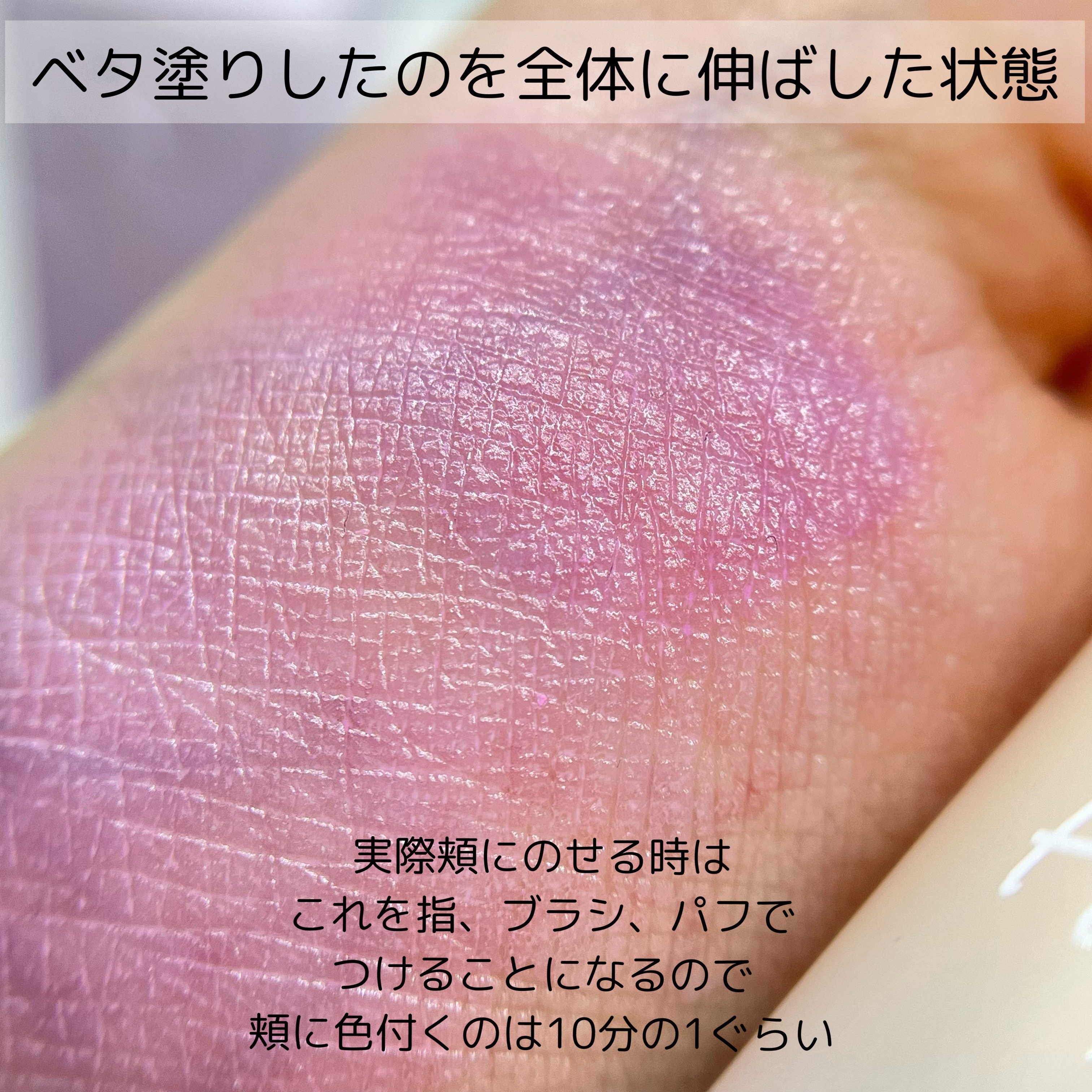 チークポップ持ってる人なら分かると思いますが、パール感は強め。 指で濃いめにつけてるので実際ブラシにとってつけるともっと薄めでモーヴカラー。 白っぽいパールなので見た目より明るめの発色。