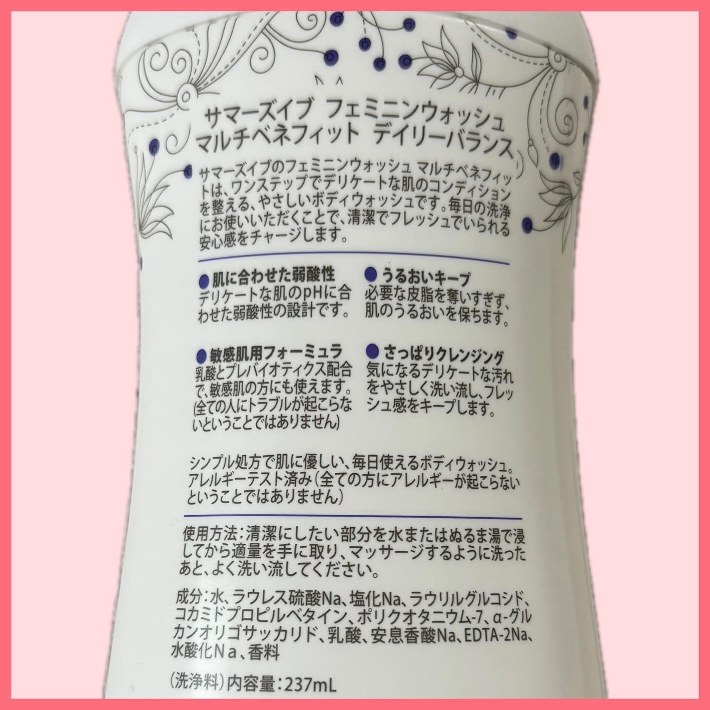 Summer'sEveサマーズイブフェミニンウォッシュマルチベネフィットデイリーバランス237ml/¥1,089(税込)肌に優しい使い心地のデリケートゾーン用ボディウォッシュ🫧デリケートな肌のphに合わせた弱酸性設計⭐デリケートゾーンのニオイ...