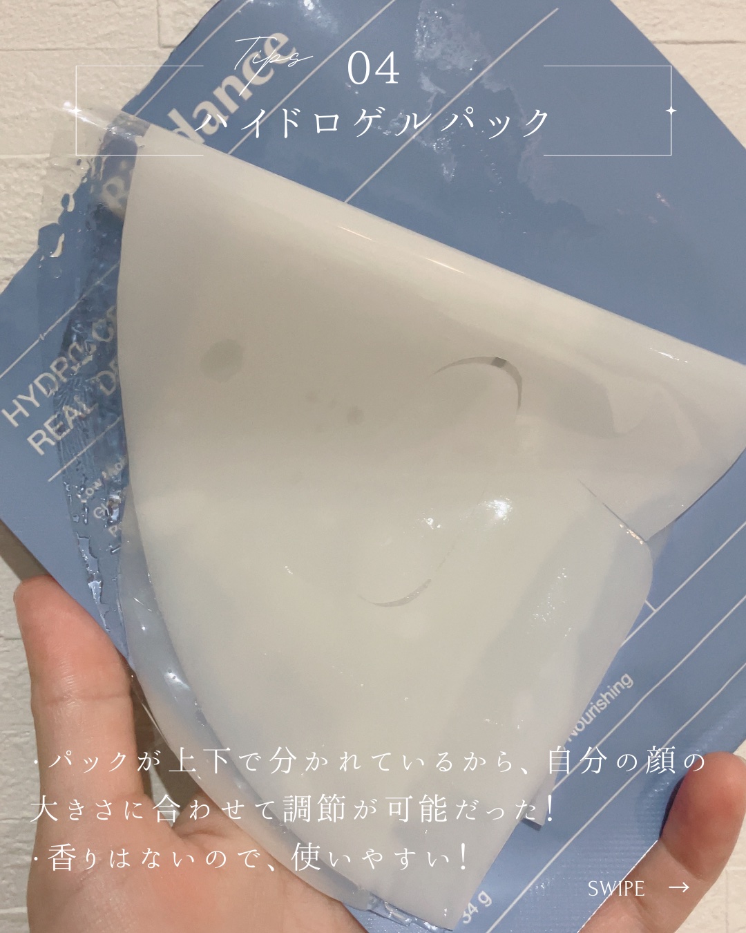 - 34gの美容液をそのまま固めて作った不織布不使用のハイドロゲルタイプのマスク。最低3時間の使用で、美容液を一滴残さずお肌に供給。