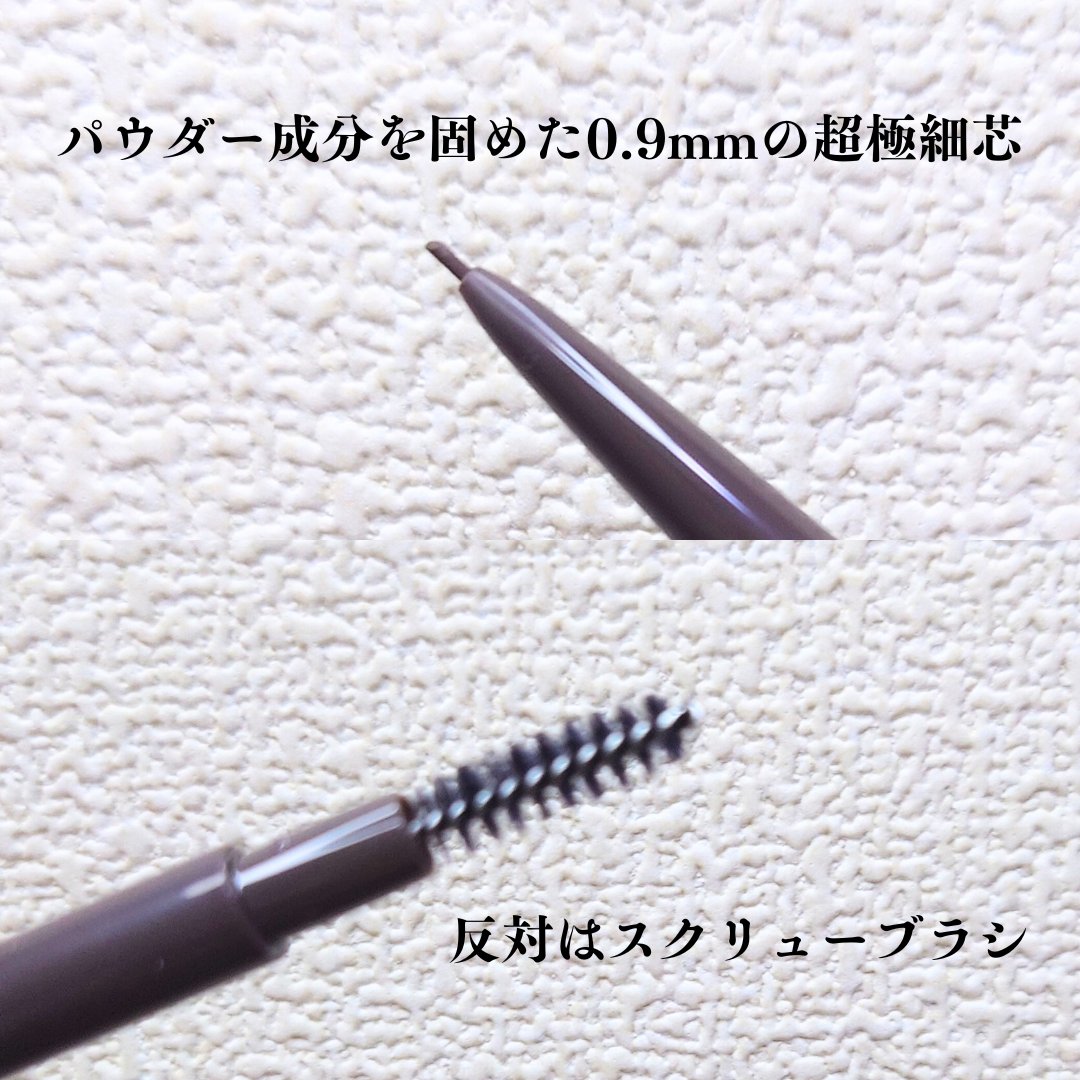 0.9mmの超極細芯‼️ バウダー成分を固めたペンシルなので ふんわり眉にもリアルな眉にも仕上がります🫶 細いから毛がない部分にも、眉尻にも描きやすい‼️ 最後にスクリューブラシでぼかせば自然な眉になる❣️ 眉毛メイク苦手な人の為に開発されてるから 本当に使いやすいよ︎︎👍