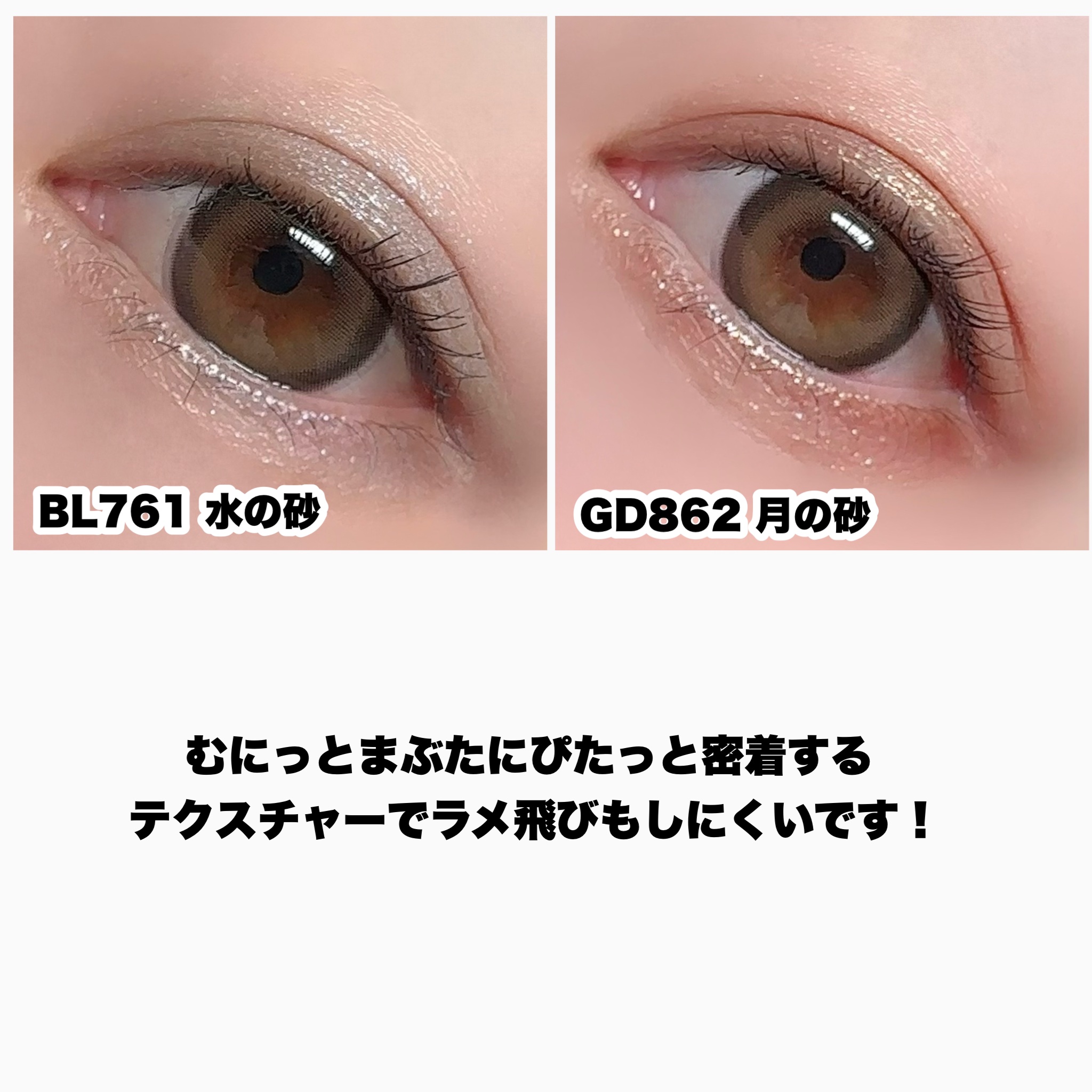 大粒の偏光グリッターラメをたっぷり配合していて美しい煌めき… ぷにっと柔らかい質感のテクスチャーは ピタッと密着してよれにくくラメ飛びもしにくい🙆♀️💕 BL761 水の砂💧:ブルーからピンクに輝くグレーベースのカラー GD862 月の砂🌕:ゴールドからグリーンに輝くブラウンベースのカラー