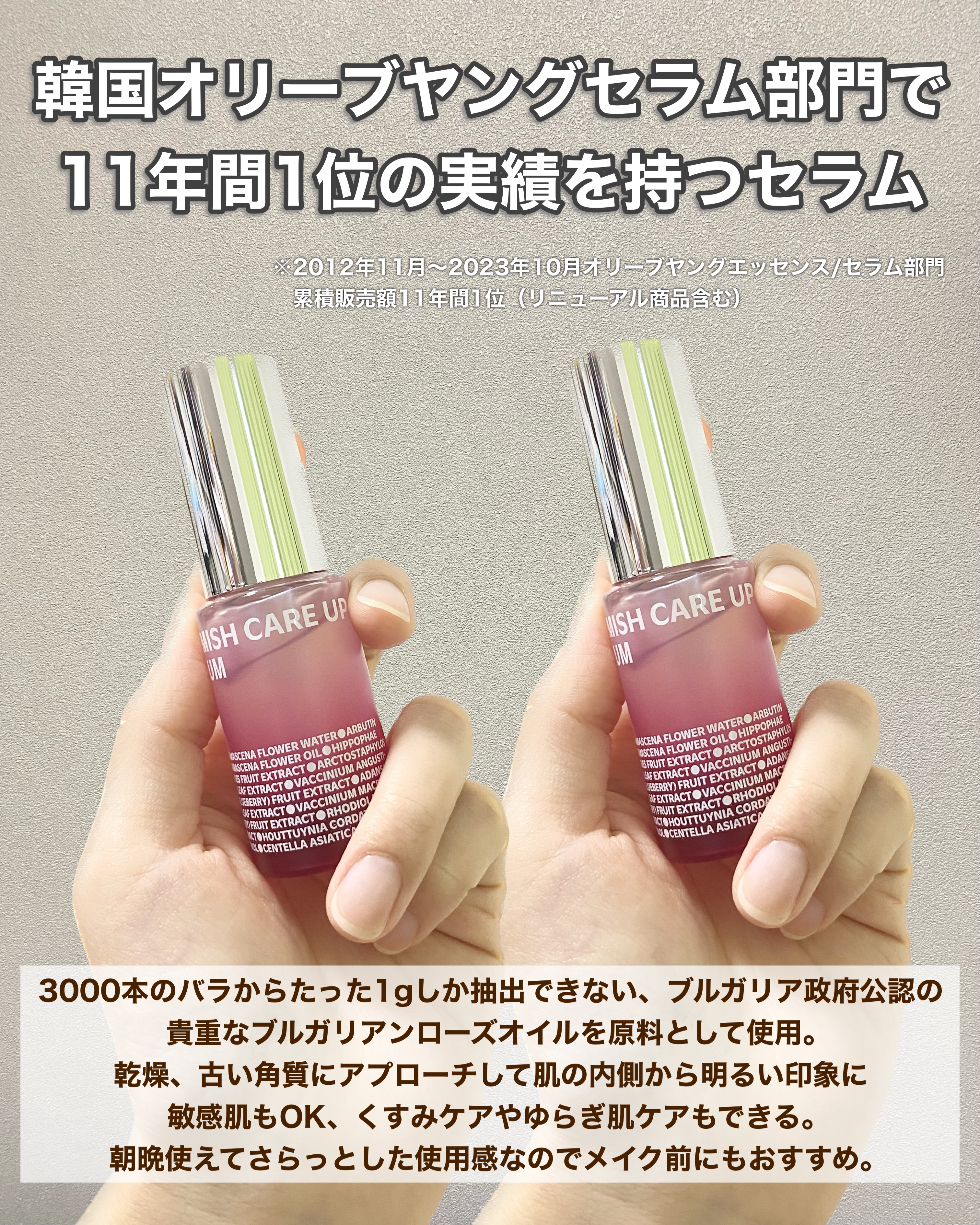 3000本のバラからたった1gしか抽出できない、ブルガリア政府公認の貴重なブルガリアンローズオイル(保湿成分)を原料として使用🌹 韓国オリーブヤングセラム部門で11年間1位の実績もある大人気のセラムです🫶🏻 みずみずしいジェル状のテクスチャーで、肌馴染みがよく潤うような使い心地🙆🏻♀️