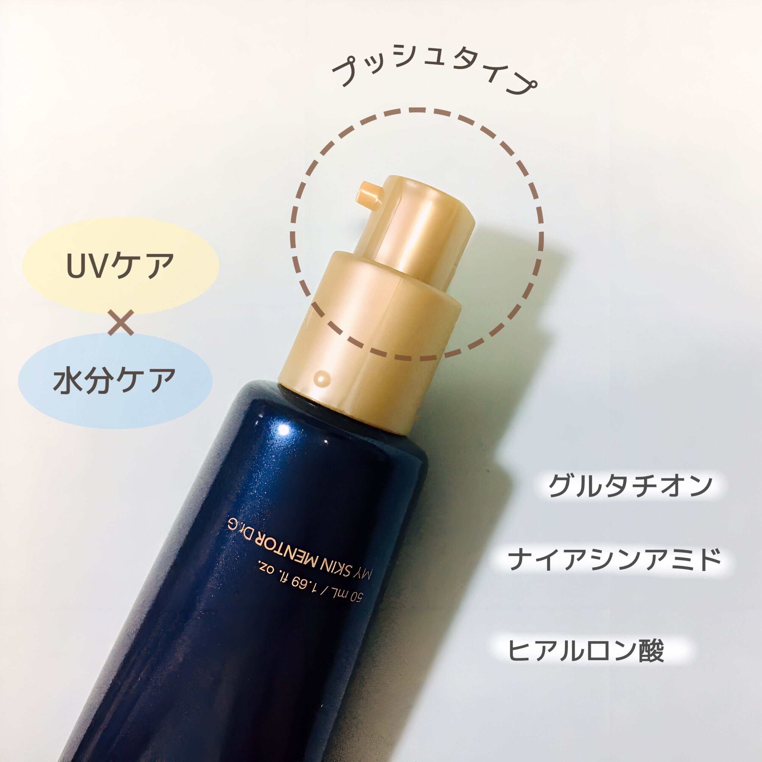 - SPF50+ PA++++ グルタチオン*やナイアシンアミド*が入った、スキンケア効果の高い、化粧下地としても使える日焼け止めです。 さらに、ヒアルロン酸*も入っているので、水分ケアまで可能!冬場でも、長時間乾燥が気になりにくい! スキンケアで肌を潤わしながら、日焼け対策もでき、化粧下地としてベースを整えてくれます。 しっとりとしたテクスチャーですが、仕上がりはベタっとせず、肌の角質層を潤わせるので、メイクの密着力を高め、長時間潤いを感じます。 ほんのりピンクがかった色で、肌に高級感と多幸感を演出してくれます。 *整肌成分