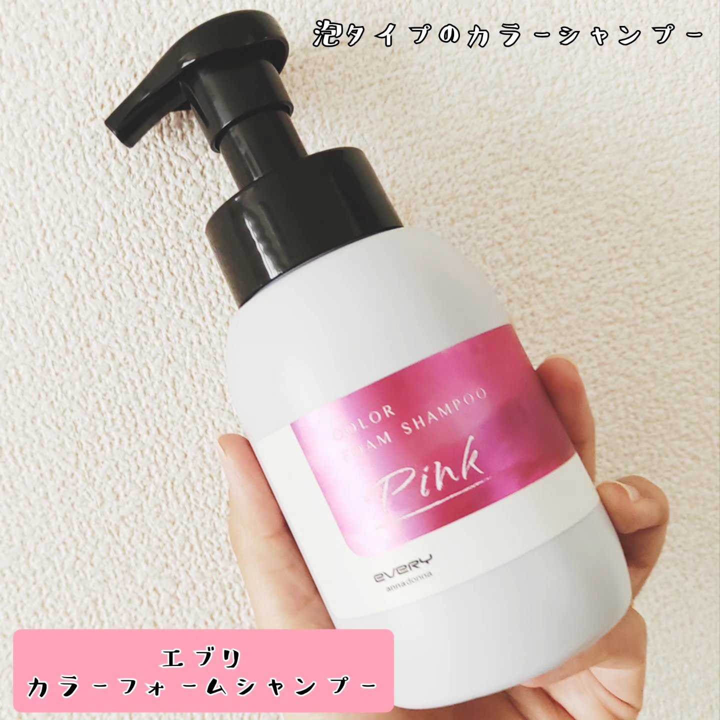 エブリカラーフォームシャンプー→泡立て不要な泡タイプ カラーフォームシャンプー。泡タイプのため、泡が髪全体をムラなく包み込んでくれます。ヘアカラーやブリーチなどのダメージにお悩みの方にもチェックしてみてほしい→今回使ったのは<ピンク>。出てく...