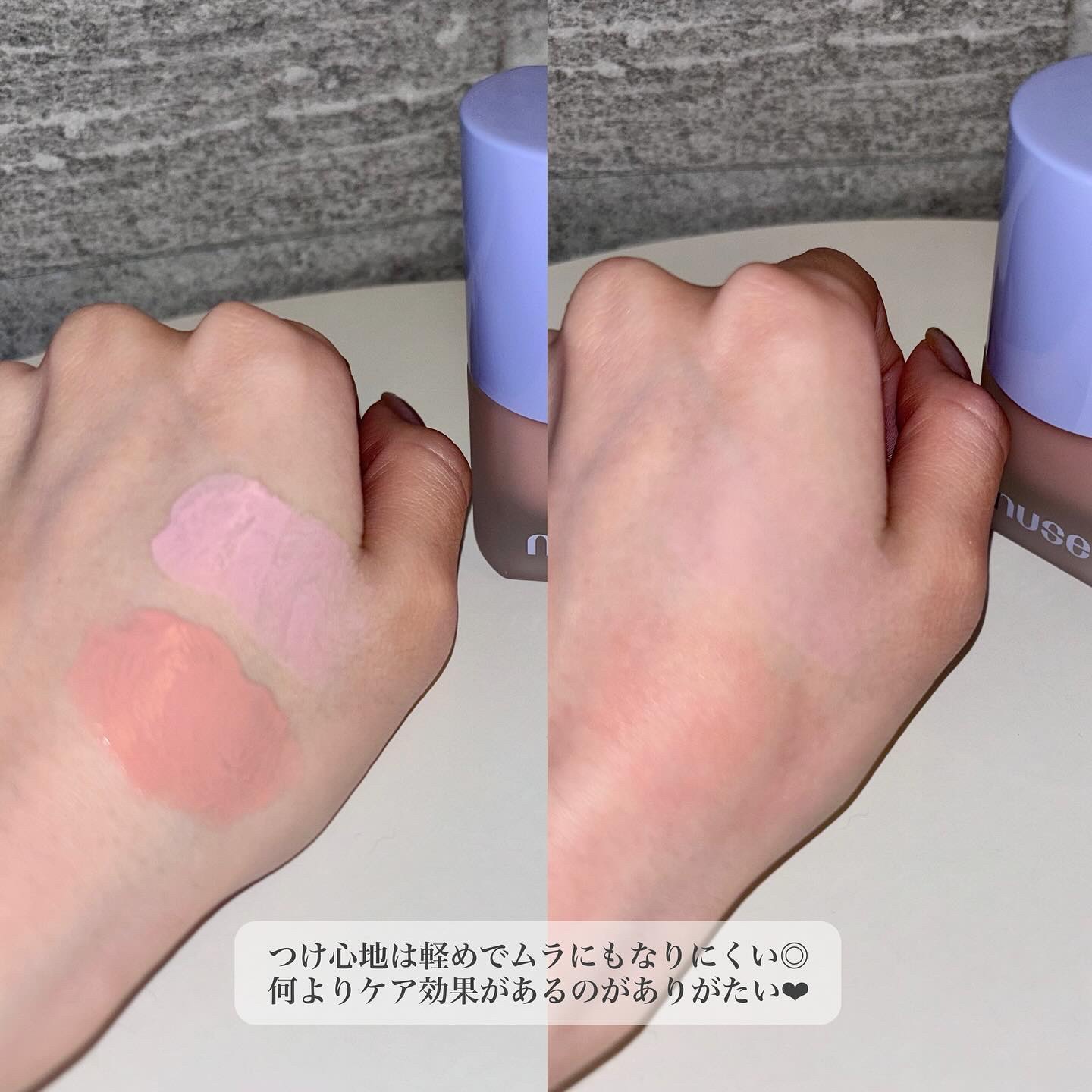 最近ハマってるnuse(ヌーズ) ロムアンドのお姉さんブランド みずみずしく、伸びもいいし、軽い付け心地💮 ツヤツヤ&ほんのりピンク♡ リキッドチーク 最初みずみずしいのに、ほわっとセミマット仕上げ◎ 密着してくれる感◎